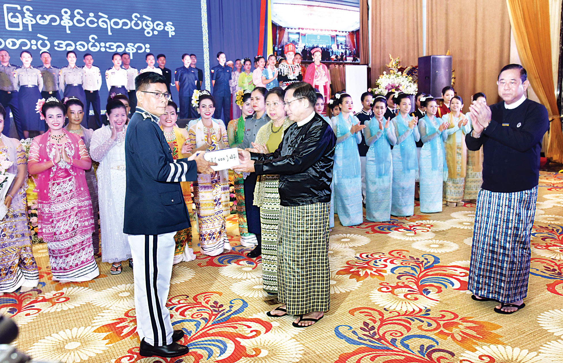 ဂုဏ်ပြုညစာ သုံးဆောင်အပြီးတွင် သီဆိုတီးမှုတ်ဖျော်ဖြေခဲ့ကြသည့် မြန်မာနိုင်ငံရဲတပ်ဖွဲ့၊ ရဲတီးဝိုင်းနှင့်ဖျော်ဖြေရေးဌာနခွဲမှ တပ်ဖွဲ့ဝင်များနှင့် အနုပညာရှင်များအား နိုင်ငံတော်ယာယီသမ္မတ နိုင်ငံတော်လုံခြုံရေးနှင့် အေးချမ်းသာယာရေးကော်မရှင်ဥက္ကဋ္ဌနှင့်ဇနီးတို့က ဂုဏ်ပြုပန်းခြင်းနှင့် ဂုဏ်ပြုဆုငွေများကို ပေးအပ်ချီးမြှင့်ခဲ့ကြောင်း သိရသည်။