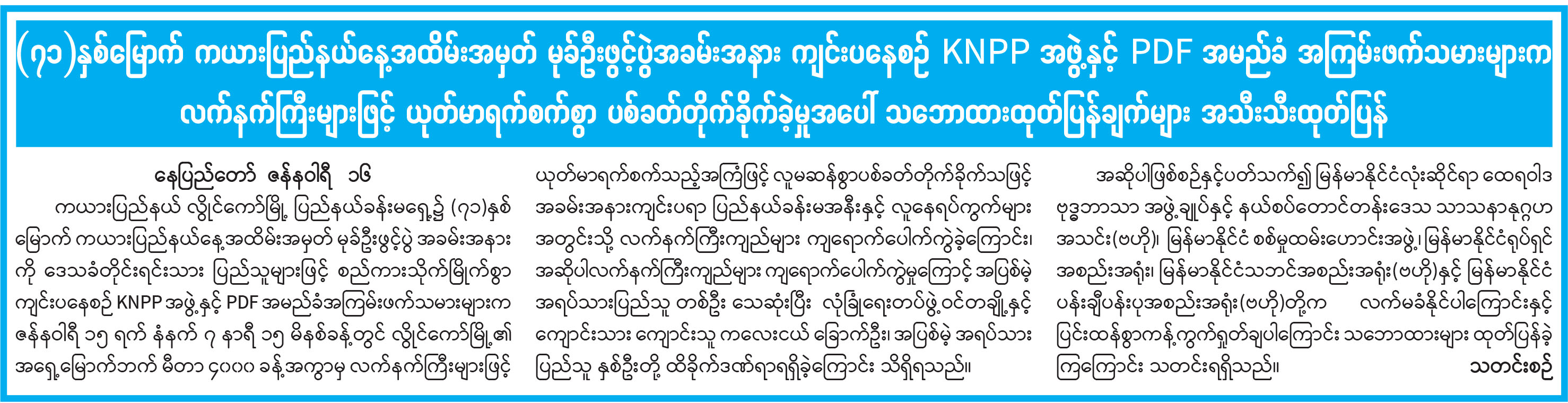 (၇၁)နှစ်မြောက် ကယားပြည်နယ်နေ့အထိမ်းအမှတ် မုခ်ဦးဖွင့်ပွဲအခမ်းအနား ကျင်းပနေစဉ် KNPP အဖွဲ့နှင့် PDF အမည်ခံ အကြမ်းဖက်သမားများက လက်နက်ကြီးများဖြင့် ယုတ်မာရက်စက်စွာ ပစ်ခတ်တိုက်ခိုက်ခဲ့မှုအပေါ် သဘောထား ထုတ်ပြန်ချက်များ အသီးသီးထုတ်ပြန်
