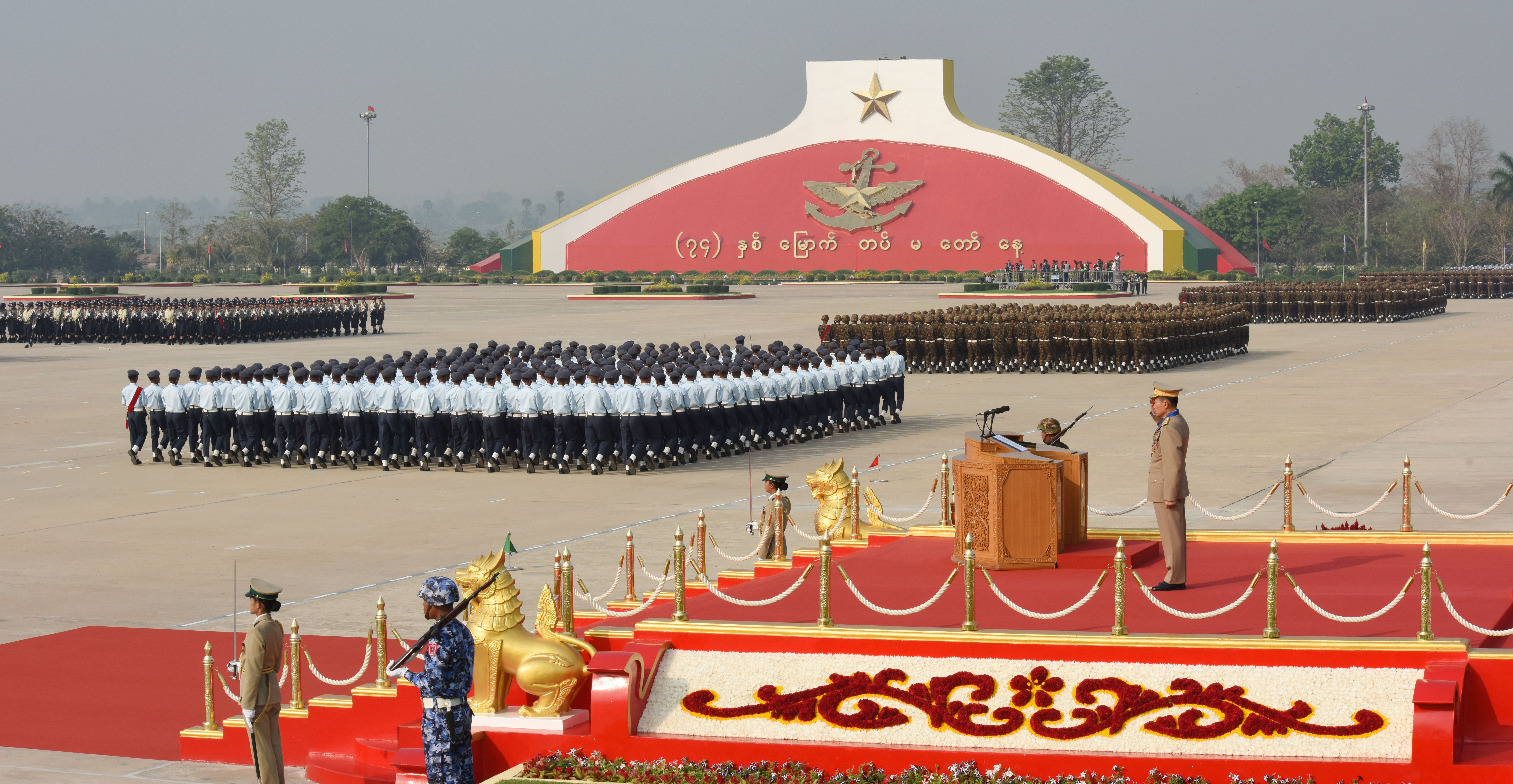 ဒုတိယတပ်မတော်ကာကွယ်ရေးဦးစီးချုပ် ကာကွယ်ရေးဦးစီးချုပ် (ကြည်း) ဒုတိယဗိုလ်ချုပ်မှူးကြီး သီရိပျံချီ စိုးဝင်းသည် တပ်မတော်နေ့စစ်ရေးပြ အခမ်းအနား ကျင်းပသည့် စစ်ရေးပြကွင်းကြီး အလေးပြုခံစင်မြင့်သို့ ရောက်ရှိရာ စစ်ကြောင်းကြီးများမှ တပ်မတော်သားများနှင့် မြန်မာနိုင်ငံရဲတပ်ဖွဲ့ဝင်များက အလေးပြုကြသည်။