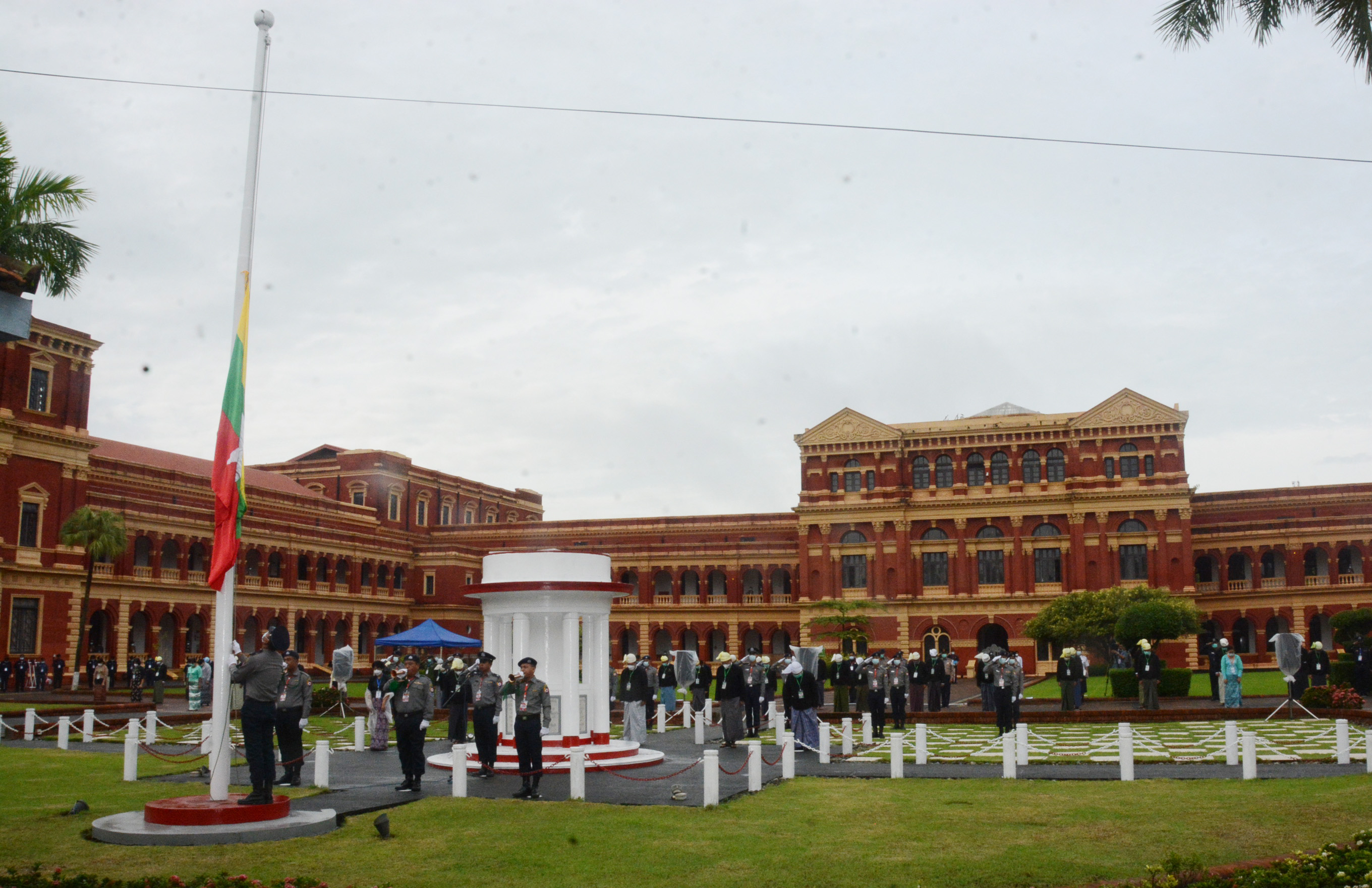 (၇၅)နှစ်မြောက် အာဇာနည်နေ့ ဝမ်းနည်းခြင်းအထိမ်းအမှတ်အဖြစ် ရန်ကုန်မြို့ ဝန်ကြီးများရုံး(ယခင်အတွင်းဝန်ရုံး)၌ နိုင်ငံတော်အလံအား တိုင်ဝက်သို့ လျှော့ချလွှင့်ထူ ခြင်း အခမ်းအနားကို ယနေ့ နံနက်ပိုင်းက ဗိုလ်ချုပ်အောင်ဆန်းနှင့်တကွ အာဇာနည် ခေါင်းဆောင်ကြီးများ ကျဆုံးခဲ့ရာ ရန်ကုန်မြို့ ဗိုလ်တထောင်မြို့နယ်ရှိ ဝန်ကြီးများရုံး (ယခင်အတွင်းဝန်ရုံး)၌ ကျင်းပသည်။