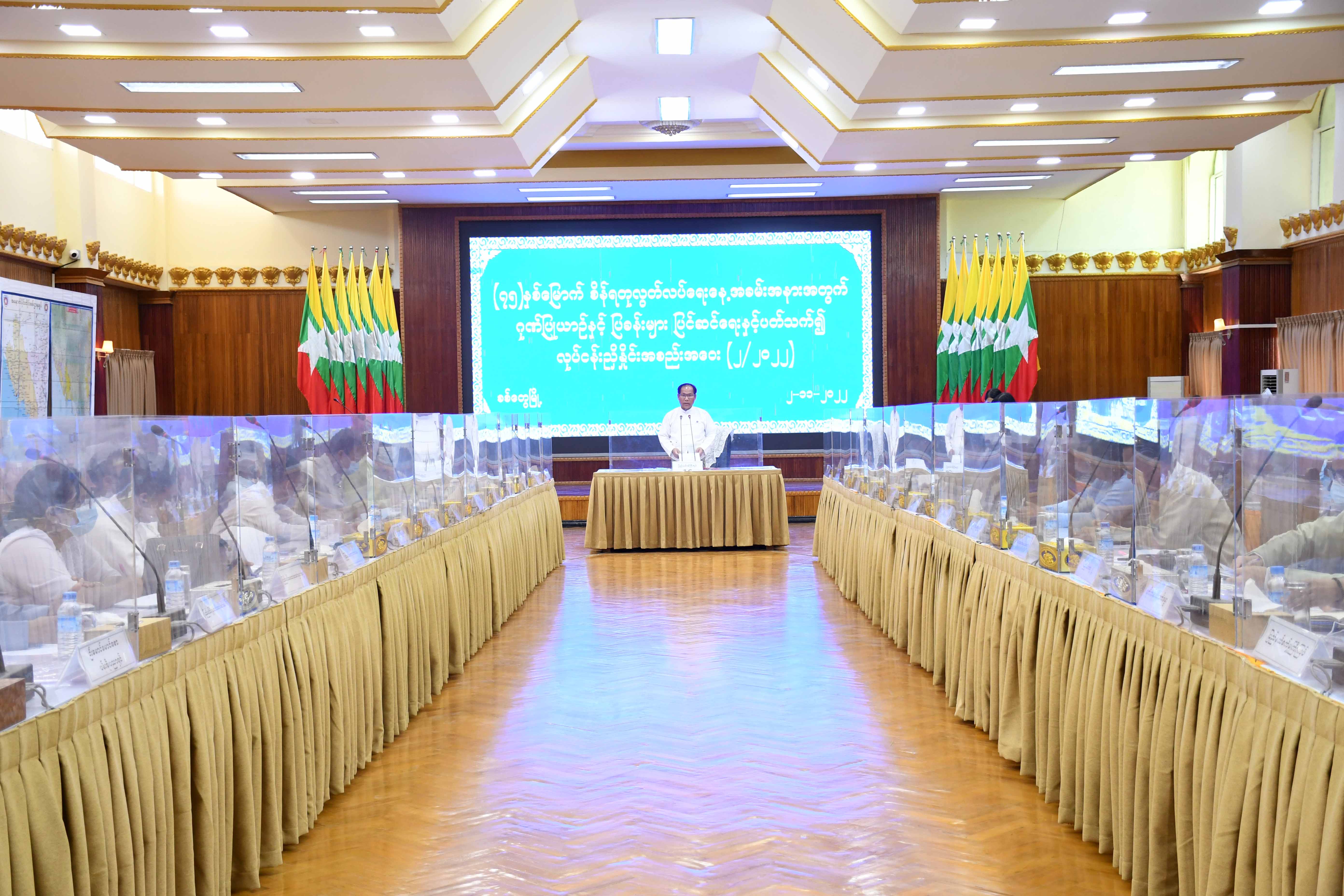 ထို့နောက် ရခိုင်ပြည်နယ်အစိုးရအဖွဲ့ရုံး၊ ညွှန်ကြားရေးမှူး ဦးရဲထွန်းဇော်က ဂုဏ်ပြုယာဉ်နှင့် ပြခန်းများ ပြင်ဆင်ခြင်းနှင့်ပတ်သက်၍ ကော်မတီဖွဲ့စည်းမှုနှင့် လုပ်ငန်းတာဝန်များကို ရှင်းလင်းတင်ပြသည်။ ဆက်လက်၍ ပြည်နယ်အစိုးရအဖွဲ့ဝင်ဝန်ကြီးများက ဂုဏ်ပြုယာဉ်နှင့် ပြခန်းများပြင်ဆင်ခြင်းနှင့် ပတ်သက်၍ ကြိုတင်ပြင်ဆင်ထားရှိမှု၊ ယခင် စိန်ရတုပြည်ထောင်စုနေ့ အခမ်းအနားတွင် တွေ့ကြုံခဲ့သည့် အသာချက်၊ အားနည်းချက်များ စသည်တို့ကို ဆွေးနွေးတင်ပြကြသည်။ ယင်းနောက် ရှေးဟောင်း သုတေသနနှင့် အမျိုးသားပြတိုက်ဦးစီးဌာန၊ ပြည်နယ်ဦးစီးမှူးက ဂုဏ်ပြုယာဉ်နှင့် ပြခန်းများပြင်ဆင်ခြင်း လုပ်ငန်း ဆောင်ရွက်နေမှုနှင့်ပတ်သက်၍ ရှင်းလင်းတင်ပြရာ ပြည်နယ်ဝန်ကြီးများနှင့် တက်ရောက် လာသူများက  ဖြည့်စွက်အကြံပြုဆွေးနွေးတင်ပြကြပြီး ပြည်နယ်ဝန်ကြီးချုပ်က နိဂုံးချုပ်အမှာစကား ပြောကြားသည်။