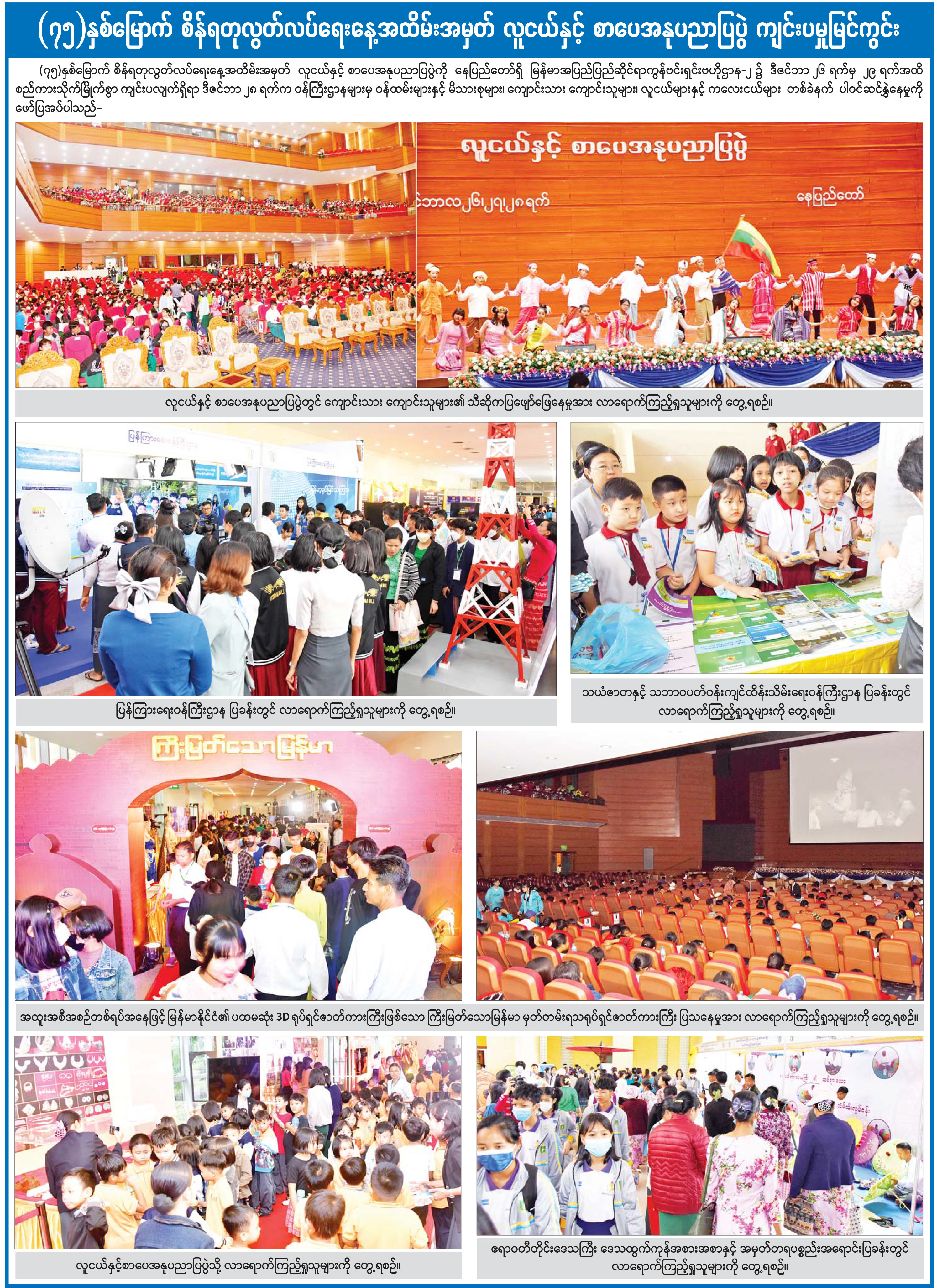 (၇၅)နှစ်မြောက် စိန်ရတုလွတ်လပ်ရေးနေ့အထိမ်းအမှတ် လူငယ်နှင့် စာပေအနုပညာပြပွဲကို နေပြည်တော်ရှိ မြန်မာအပြည်ပြည်ဆိုင်ရာ ကွန်ဗင်းရှင်းဗဟိုဌာန-၂ ၌ ဒီဇင်ဘာ ၂၆ ရက်မှ ၂၉ ရက်အထိ စည်ကားသိုက်မြိုက်စွာ ကျင်းပလျက်ရှိရာ ဒီဇင်ဘာ ၂၈ ရက်က ဝန်ကြီးဌာနများမှ ဝန်ထမ်းများနှင့် မိသားစုများ၊ ကျောင်းသား ကျောင်းသူများ၊ လူငယ်များနှင့် ကလေးငယ်များ တစ်ခဲနက် ပါဝင်ဆင်နွှဲနေမှုကို ဖော်ပြအပ်ပါသည်-