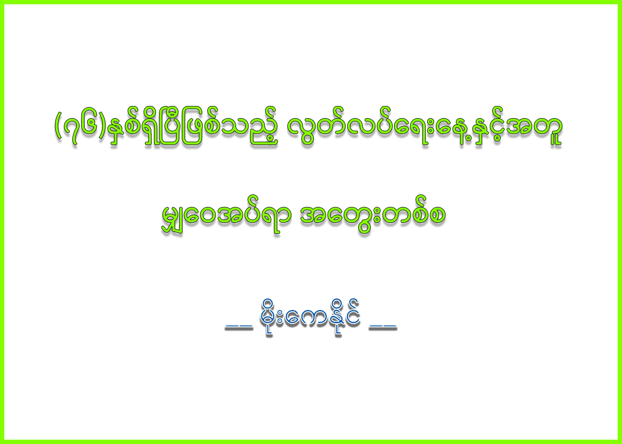 မြန်မာနိုင်ငံတော်ကြီး လွတ်လပ်ရေးရခဲ့သည်မှာ (၇၆) နှစ်ရှိပါပြီ။ သို့သော် နိုင်ငံကား မငြိမ်းချမ်းနိုင်သေး၊ ဖွံ့ဖြိုးမှုကား နောက်ကျဆဲ၊ တိုးတက်မှုကား တုံ့ဆိုင်းဆဲ၊ တွန်းအားများနှင့် ရွေ့မည်ကြံတိုင်း ခရီးကား မရောက်၊ လှော်ရင်းနစ်နေသည်၊ မာယာများသည့်မြစ်ရေအယဉ်မှာ နစ်သထက်မနစ်အောင် လှေကိုကြိုးစား လှော်နေရသည်။