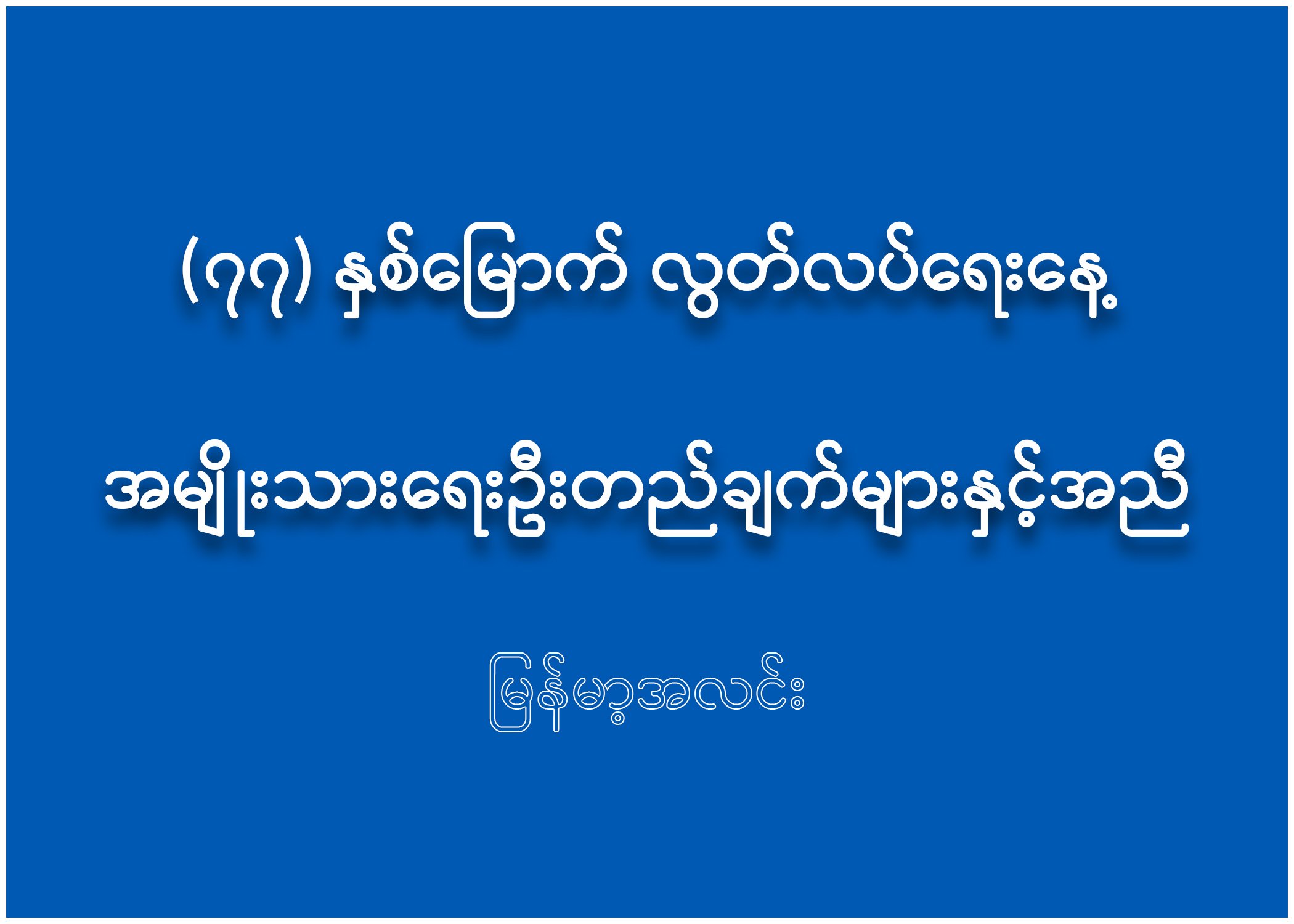 သို့ဖြစ်ရာ (၇၇) နှစ်မြောက် လွတ်လပ်ရေးနေ့ အမျိုးသားရေး ဦးတည်ချက် (၅) ရပ်ဖြစ်သော (၁) ပြည်ထောင်စု မပြိုကွဲရေး၊ တိုင်းရင်းသားစည်းလုံးညီညွတ်မှုမပြိုကွဲရေး၊ အချုပ်အခြာအာဏာ တည်တံ့ခိုင်မြဲရေးအတွက် လက်နက်ကိုင်ပဋိပက္ခများနှင့် သဘောထားကွဲလွဲမှုများကို ဥပဒေနှင့်အညီ ထိန်းသိမ်းဆောင်ရွက်ရေး၊ (၂) နိုင်ငံသူနိုင်ငံသားအားလုံးတို့က စည်းလုံးညီညွတ်စွာဖြင့် ပြည်ထောင်စုစိတ်ဓာတ်အရင်းခံကာ နိုင်ငံတော်ကို ဝိုင်းဝန်းကာကွယ် စောင့်ရှောက်ထိန်းသိမ်းရေး၊ (၃) စစ်မှန်၍ စည်းကမ်းပြည့်ဝသော ဒီမိုကရေစီစနစ် ဖြစ်ပေါ်လာစေရေးအတွက် တရားမျှတသော၊ သိက္ခာရှိသော၊ နည်းလမ်းကျနမှန်ကန်မှုရှိသော အထွေထွေ ရွေးကောက်ပွဲပြန်လည်ကျင်းပနိုင်ရေး၊ (၄) ပြည်ထောင်စုကြီးတစ်ခုလုံး ဘက်စုံထောင့်စုံဟန်ချက်ညီညီ ဖွံ့ဖြိုးတိုးတက်ရန်အတွက် ပြည်သူလူထု တစ်ရပ်လုံး၏ “စုပေါင်းအား” ဖြင့် ဆောင်ရွက်ရေး၊ (၅) “ရှေ့သို့ချီမည် ပန်းတိုင်ဆီ” ဆိုသည့် ဆောင်ပုဒ်အတိုင်း နိုင်ငံရေး၊ စီးပွားရေး၊ ကာကွယ်ရေး၊ အမျိုးသားရေးစရိုက်လက္ခဏာနှင့် အမျိုးသားစိတ်ဓာတ်မြှင့်တင်ရေးတို့အတွက် ခိုင်မာသည့်ဇွဲ၊ လုံ့လ၊ ဝီရိယထားပြီး စည်းလုံးညီညွတ်စွာဖြင့် ကြိုးပမ်းဖော်ဆောင်ရေးတို့နှင့်အညီ ပြည်ထောင်စုကြီးအတွင်း မှီတင်းနေထိုင်ကြကုန်သော နိုင်ငံသူ နိုင်ငံသား ပြည်သူတစ်ရပ်လုံးက မဆုတ်မနစ် အားမာန်သစ်တို့ဖြင့် စုပေါင်းညီညာ အကောင်အထည်ဖော်ကြရပါမည့် အကြောင်း။