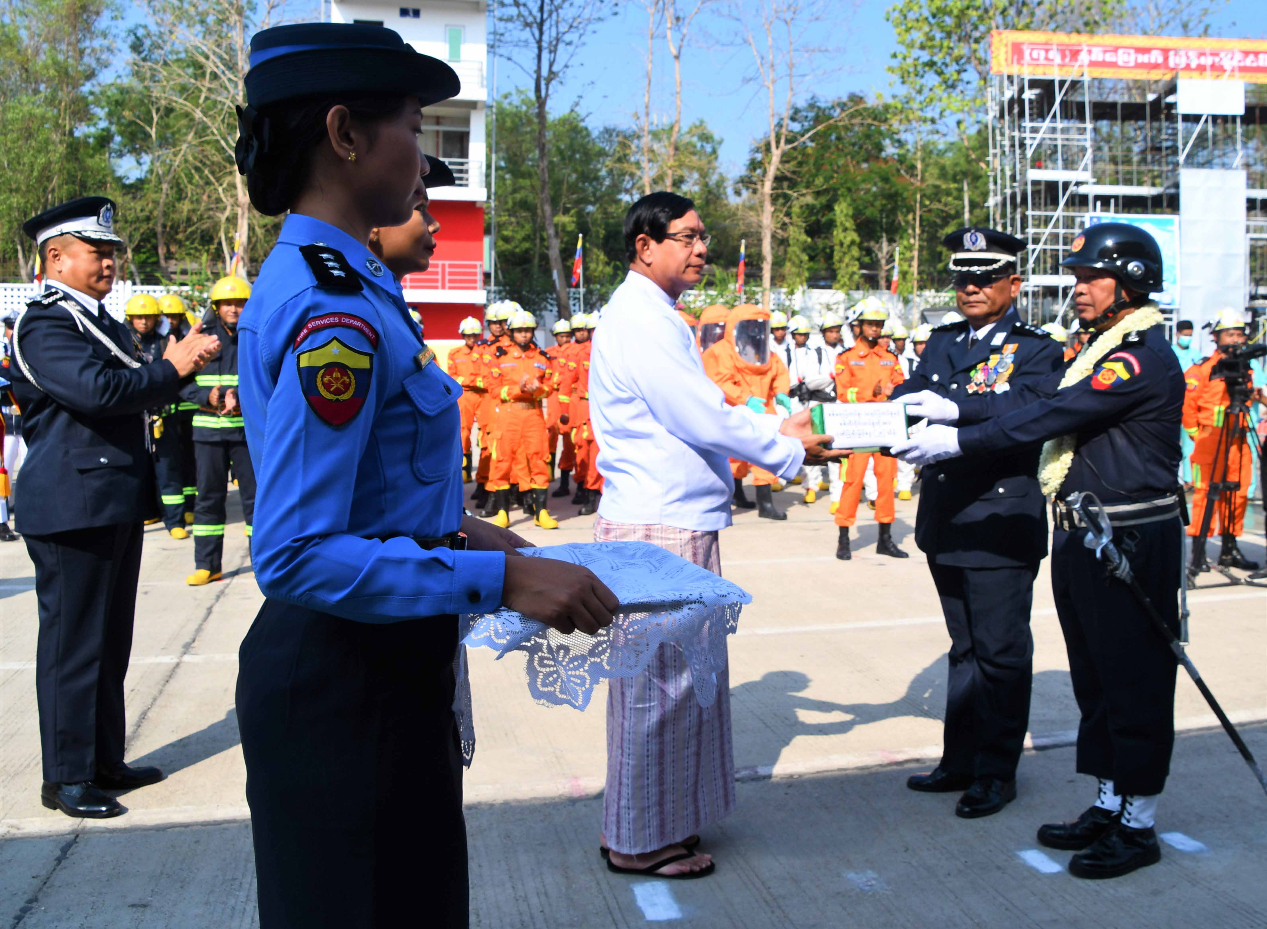ယင်းနောက် မြန်မာနိုင်ငံမီးသတ်တပ်ဖွဲ့ဌာနချုပ်မှ သရုပ်ပြတပ်ခွဲက မီးငြိမ်းသတ်ရေးနှင့် ရှာဖွေ ကယ်ဆယ်ရေးစွမ်းရည် သရုပ်ပြကွက်များဖြစ်သော Brave Heart, Emergency Medical Services (EMS)နှင့် လေ့ကျင့်ရေးမျှော်စင်၌ ရေသန့်ရေခဲစက်ရုံမှ အမိုးနီးယားဓာတ်ငွေ့ ယိုစိမ့်မှုဖြစ်စဉ်တွင် လူများကို ကယ်ထုတ်ခြင်းနှင့် မီးငြှိမ်းသတ်ခြင်း ဆောင်ရွက်မှုအဆင့်ဆင့်၊ မီးသတ်တပ်ဖွဲ့၏ စွမ်းဆောင်ရည်တို့ကို သရုပ်ဖော်ပြသသည်။