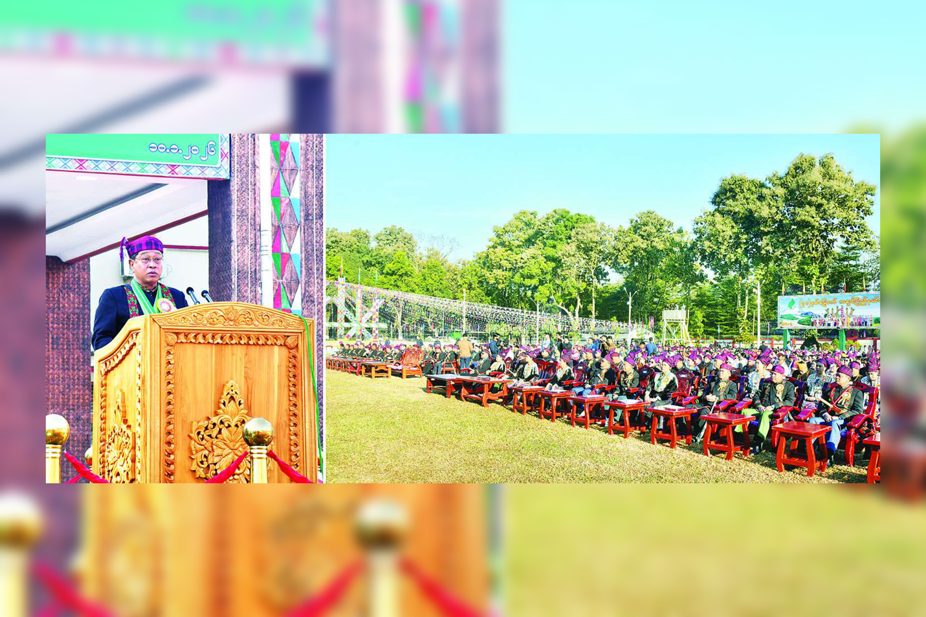 ဦးစွာ ပြည်ထောင်စုသမ္မတမြန်မာ နိုင်ငံတော်ယာယီသမ္မတ နိုင်ငံတော်လုံခြုံရေးနှင့် အေးချမ်းသာယာရေးကော်မရှင်ဥက္ကဋ္ဌ ဗိုလ်ချုပ်မှူးကြီး သတိုးမဟာသရေစည်သူ သတိုးသီရိသုဓမ္မ မင်းအောင်လှိုင်ထံမှ (၇၈) နှစ်မြောက် ကချင်ပြည်နယ်နေ့အခမ်းအနားသို့ ပေးပို့သည့် သဝဏ်လွှာကို ပြည်ထောင်စုဝန်ကြီး ဦးတင်အောင်စန်းက ဖတ်ကြားသည်။