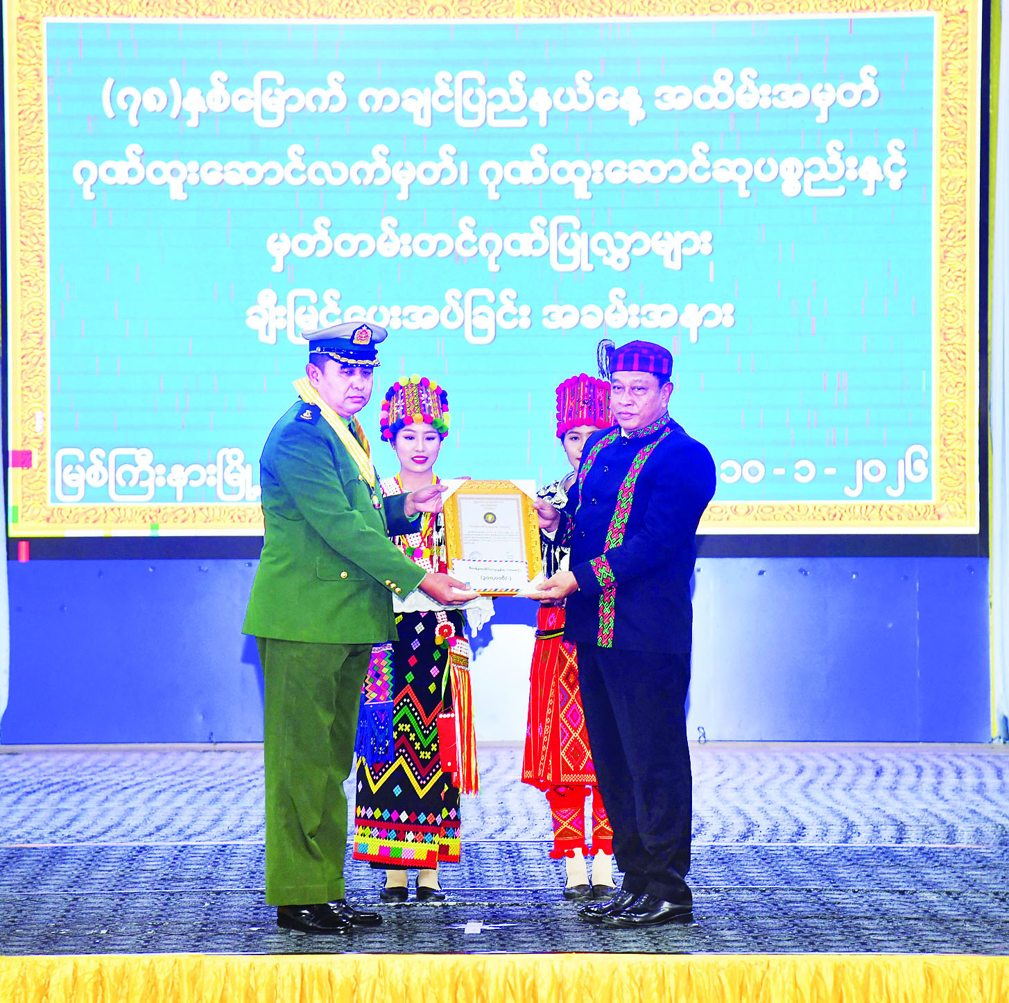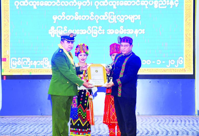 ထို့နောက် ပြည်နယ်ပြည်သူ့အားကစားကွင်းအတွင်းရှိ မိုးလုံလေလုံ အားကစားခန်းမ၌ ကျင်းပသည့် (၇၈) နှစ်မြောက် ကချင်ပြည်နယ်နေ့ အထိမ်းအမှတ် ပြည်နယ်ဖွံ့ဖြိုးရေး၊ စီးပွားရေးနှင့် လူမှုရေးကဏ္ဍများတွင် စွမ်းစွမ်းတမံဆောင်ရွက်ခဲ့ကြသည့် လူပုဂ္ဂိုလ်၊ အဖွဲ့အစည်းများအား ဂုဏ်ထူးဆောင်လက်မှတ်၊ ဂုဏ်ထူးဆောင်ဆုပစ္စည်းများနှင့် ဂုဏ်ပြုမှတ်တမ်းလွှာ ပေးအပ်ချီးမြှင့်ခြင်းအခမ်းအနားသို့ တက်ရောက်ကြသည်။