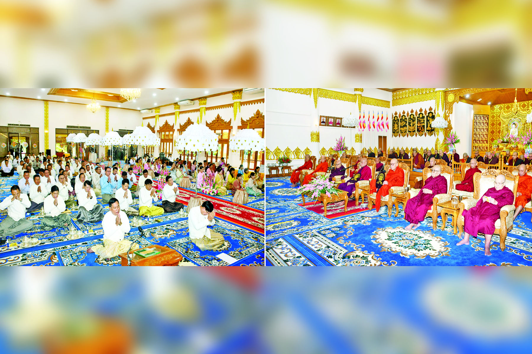 ဦးစွာ ဧည့်ပရိသတ်များက တိပိဋကဓရ တိပိဋက ကောဝိဒရွေးချယ်ရေးအဖွဲ့ ဩဝါဒါစရိယ ဥက္ကဋ္ဌ ဆရာတော်၊ ဧရာဝတီတိုင်းဒေသကြီး ဟင်္သာတမြို့ မိုးကောင်းကျောင်းတိုက် ပဓာနနာယက အဘိဓဇ မဟာရဋ္ဌဂုရု အဘိဓဇအဂ္ဂမဟာသဒ္ဓမ္မဇောတိက ဘဒ္ဒန္တသုဓမ္မာစာရာဘိဝံသ မဟာထေရ်မြတ်ထံမှ ငါးပါးသီလခံယူဆောက်တည်ကြပြီး ဆရာတော် သံဃာတော်များ ရွတ်ပွားချီးမြှင့်တော်မူသည့် ပရိတ်တရားတော်များကို နာယူကြည်ညိုကြသည်။