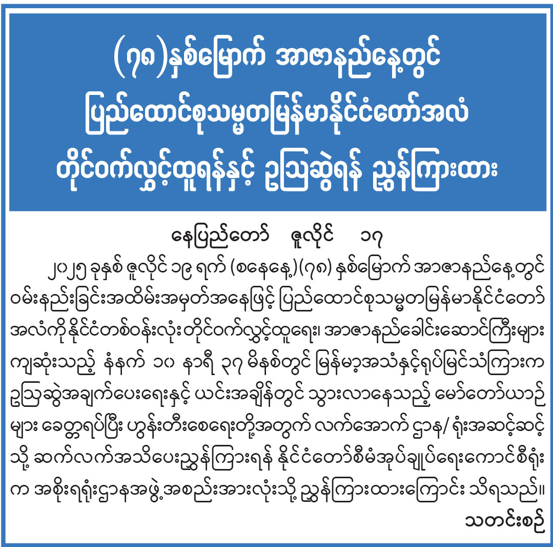 (၇၈)နှစ်မြောက် အာဇာနည်နေ့တွင် ပြည်ထောင်စုသမ္မတမြန်မာနိုင်ငံတော်အလံ တိုင်ဝက်လွှင့်ထူရန်နှင့် ဥဩဆွဲရန် ညွှန်ကြား