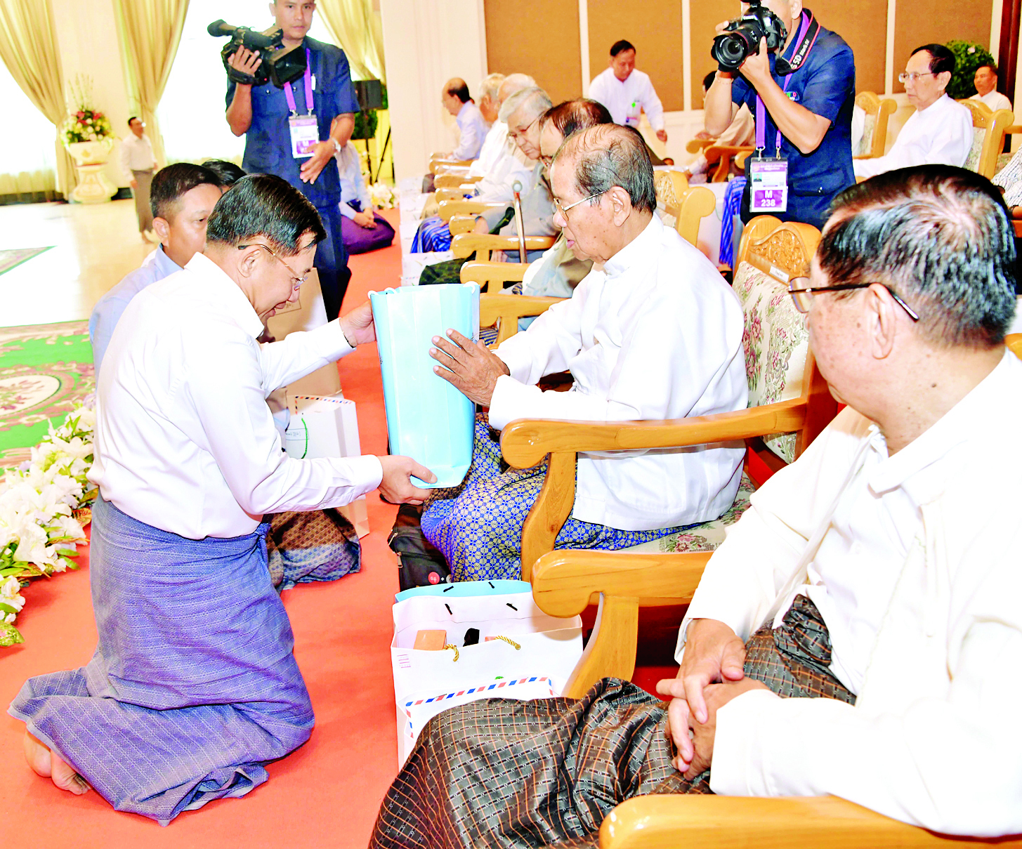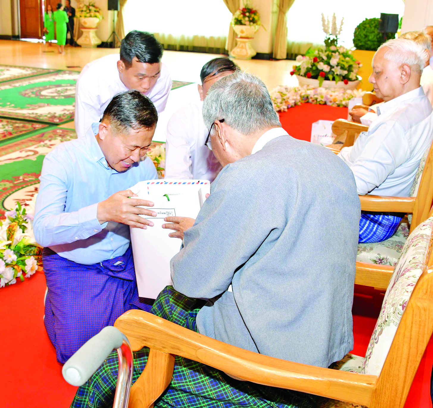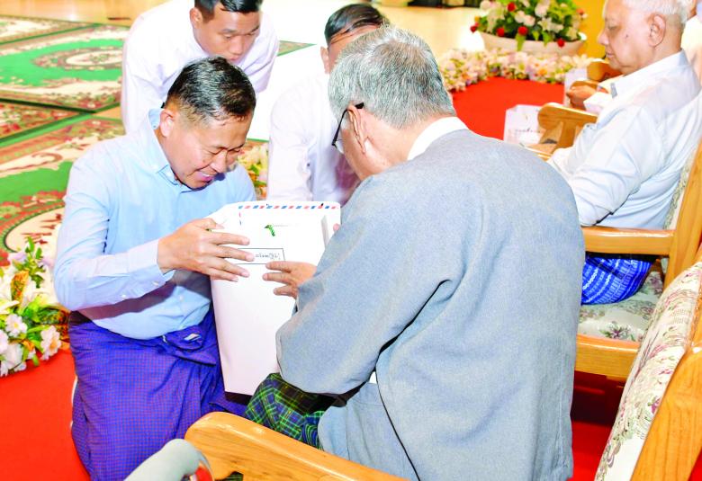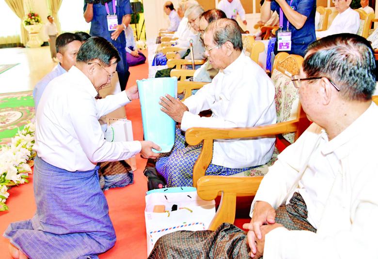 ယင်းနောက် နိုင်ငံတော်စီမံအုပ်ချုပ်ရေး ကောင်စီဥက္ကဋ္ဌ တပ်မတော်ကာကွယ်ရေး ဦးစီးချုပ်နှင့်ဇနီး၊ ကောင်စီဒုတိယဥက္ကဋ္ဌ ဒုတိယတပ်မတော် ကာကွယ်ရေးဦးစီးချုပ် ကာကွယ်ရေးဦးစီးချုပ် (ကြည်း) နှင့်ဇနီး၊ တပ်မတော်အရာရှိကြီးများက အငြိမ်းစား တပ်မတော်အရာရှိကြီးများထံ ဂါရဝပြု လက်ဆောင်ပစ္စည်းများကို ကိုယ်တိုင်ကိုယ်ကျ ရိုသေစွာဂါရဝပြု ပေးအပ်ကြသည်။