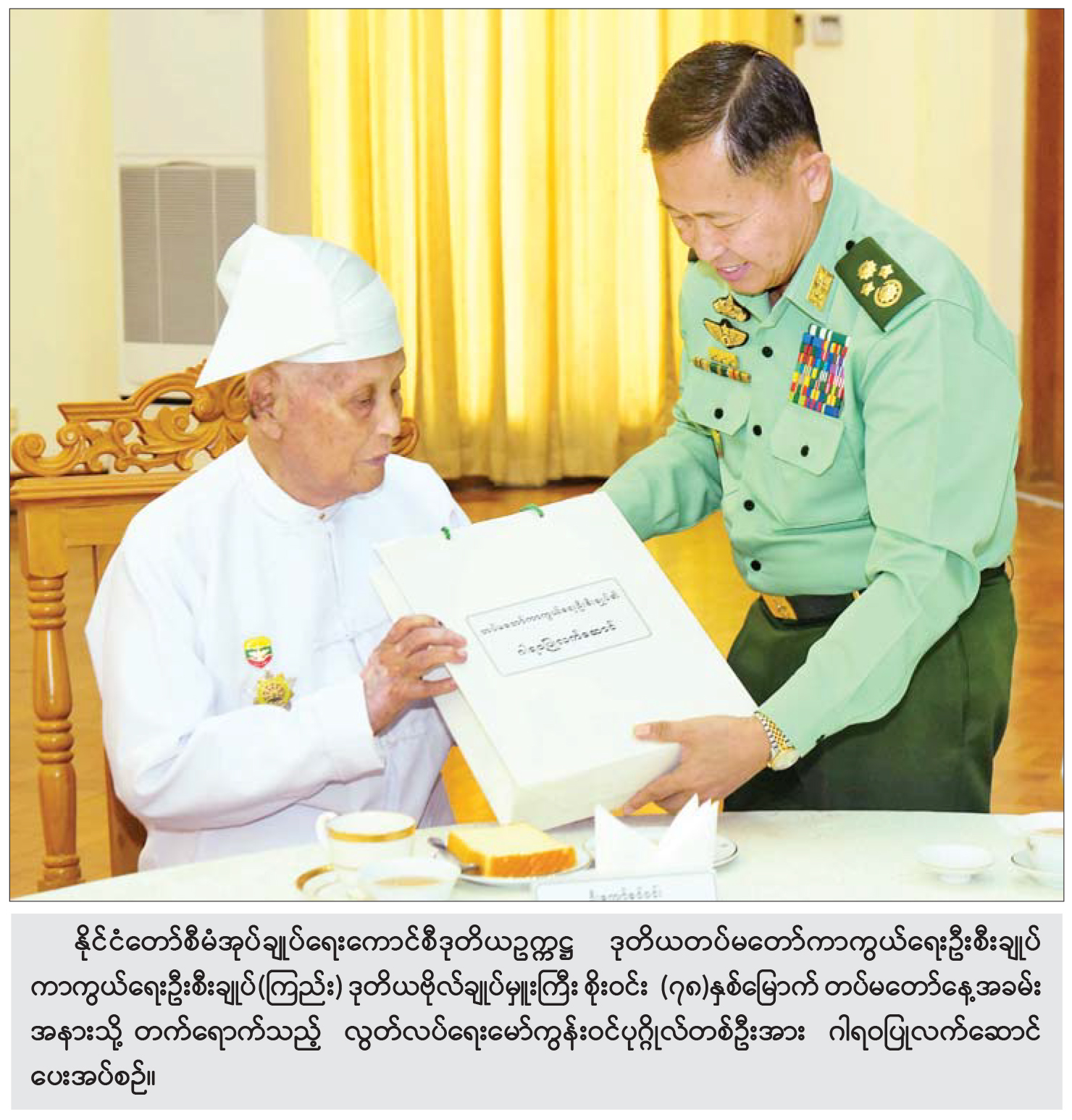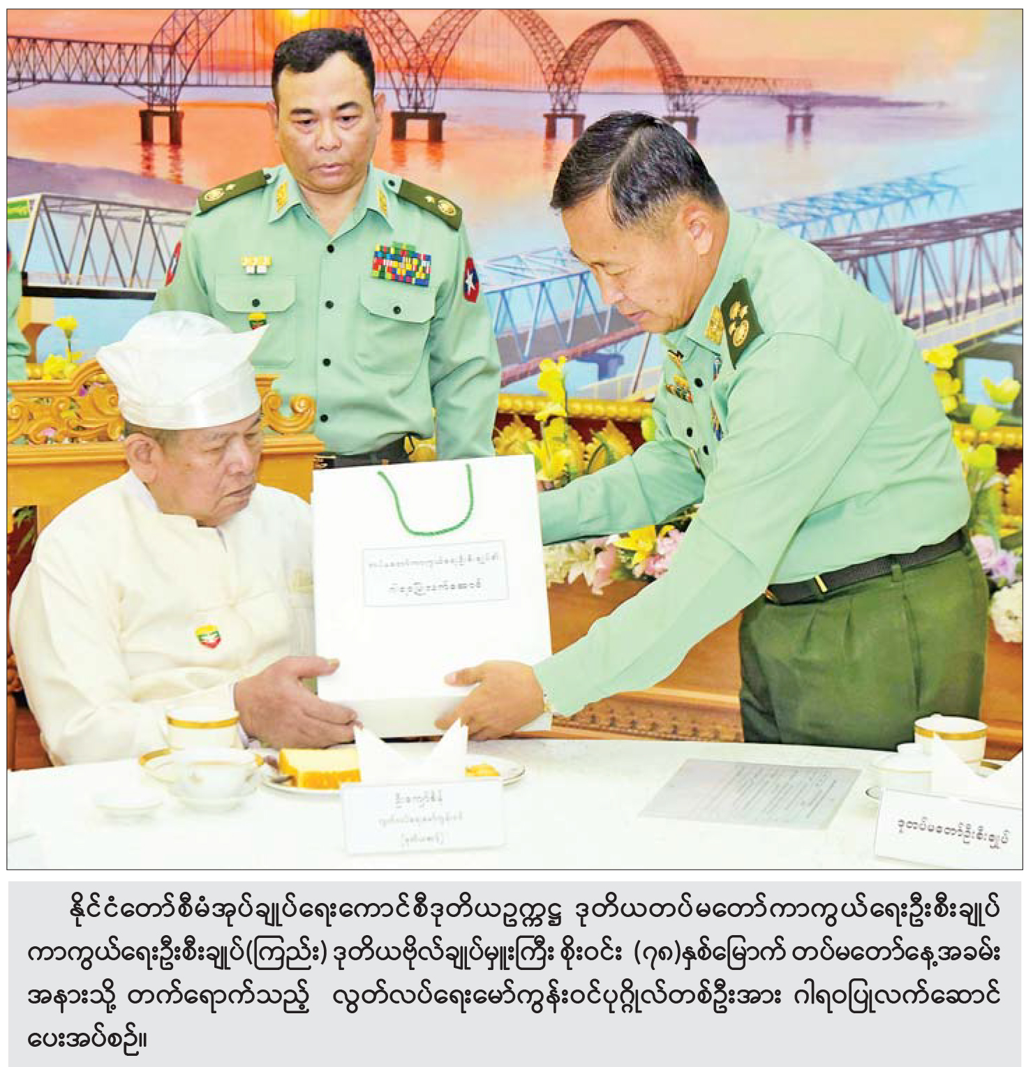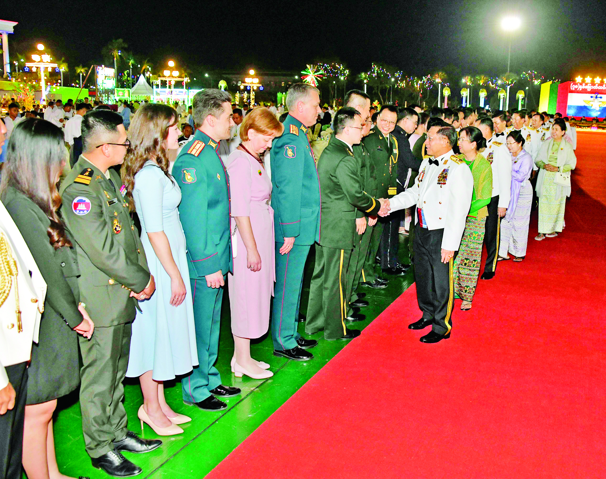 နိုင်ငံတော် စီမံအုပ်ချုပ်ရေး ကောင်စီဥက္ကဋ္ဌ တပ်မတော် ကာကွယ်ရေးဦးစီးချုပ် ဗိုလ်ချုပ်မှူးကြီး မင်းအောင်လှိုင်နှင့် ဇနီးဒေါ်ကြူကြူလှတို့က တည်ခင်းဧည့်ခံသည့် ၂၀၂၃ ခုနှစ် (၇၈)နှစ် မြောက် တပ်မတော်နေ့ အထိမ်းအမှတ် ဧည့်ခံပွဲနှင့် ဂုဏ်ပြုညစာစားပွဲ အခမ်းအနားကို ယနေ့ညပိုင်းတွင် နေပြည်တော်ရှိ ဇေယျာသီရိဗိမာန် ဥပစာရင်ပြင်၌ ကျင်းပပြုလုပ်သည်။