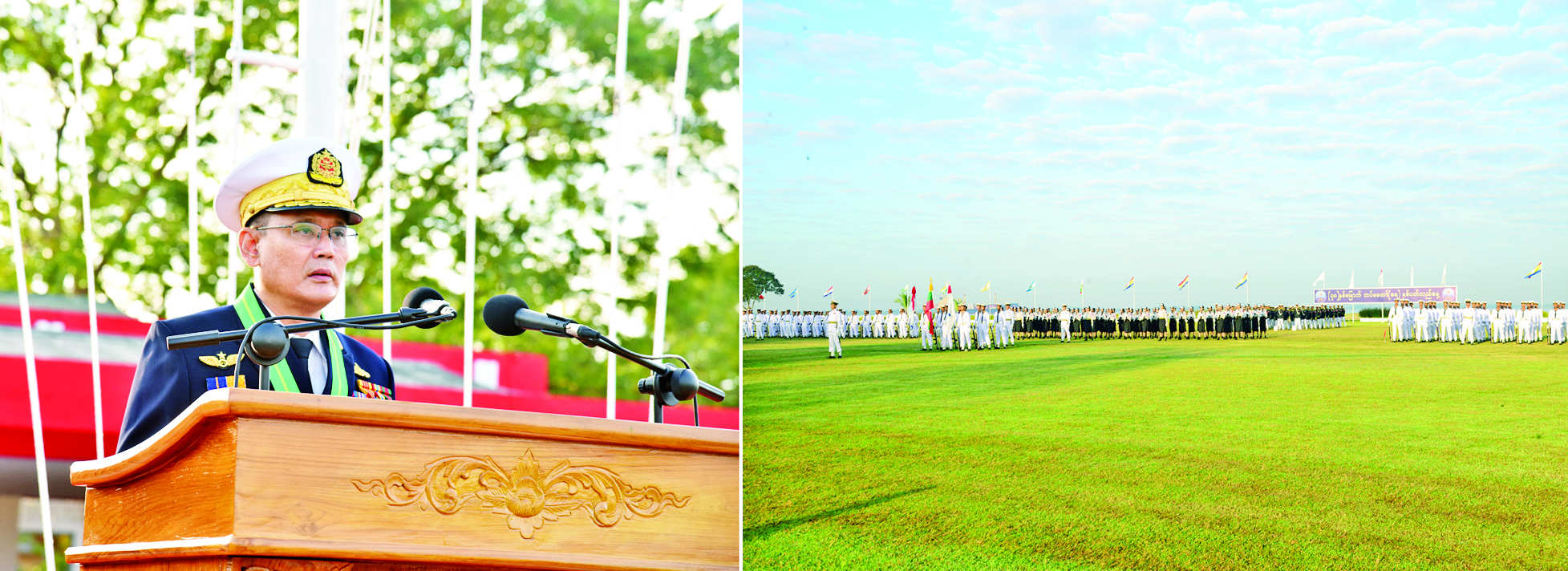 (၇၈)နှစ်မြောက် တပ်မတော် (ရေ) နှစ်ပတ်လည်နေ့ အထိမ်းအမှတ် ဂုဏ်ပြုစစ်ရေးပြ အခမ်း အနားကို ယနေ့နံနက်ပိုင်းတွင် သန်လျင်တပ်နယ်ရှိ ရေတပ်လေ့ကျင့်ရေးဌာနချုပ် စစ်ရေးပြ ကွင်း၌ ကျင်းပရာ ကာကွယ်ရေးဦးစီးချုပ်(ရေ) ဗိုလ်ချုပ်ကြီး ထိန်ဝင်း၊ စစ်ဦးစီးအရာရှိချုပ်(ရေ) ဒုတိယဗိုလ်ချုပ်ကြီး အေးမင်းထွေး၊ အငြိမ်းစားကာကွယ်ရေးဦးစီးချုပ် (ရေ)များ၊ ရေတပ်ကွပ်ကဲမှု ဌာနချုပ်မှူးများ၊ ရေတပ်စခန်းဌာနချုပ်မှူးများ၊ သန်လျင်တပ်နယ်မှ တာဝန်ရှိသူများ၊ အရာရှိ၊ စစ်သည်၊ မိသားစုဝင်များနှင့် ဖိတ်ကြားထားသူများ တက်ရောက်ကြသည်။
