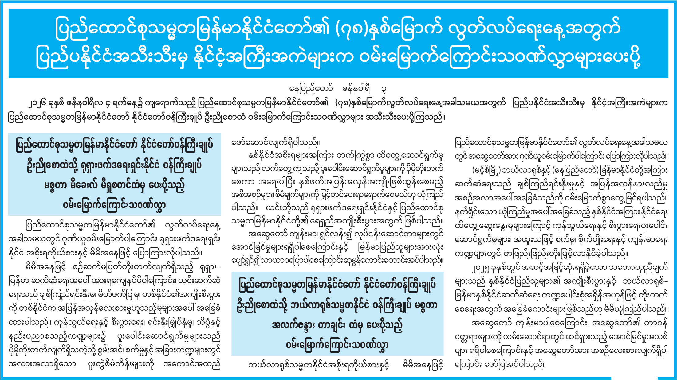 (၇၈)နှစ်မြောက်လွတ်လပ်ရေးနေ့အခါသမယအတွက် ပြည်ပနိုင်ငံအသီးသီးမှ နိုင်ငံ့အကြီးအကဲများက ပြည်ထောင်စုသမ္မတမြန်မာနိုင်ငံတော် နိုင်ငံတော်ဝန်ကြီးချုပ် ဦးညိုစောထံ ဝမ်းမြောက်ကြောင်းသဝဏ်လွှာများ အသီးသီးပေးပို့