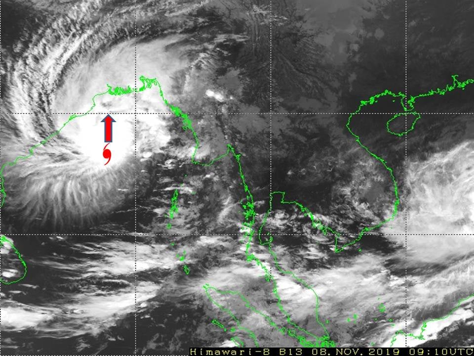 ၂၀၁၉ ခုနှစ်၊ နိုဝင်ဘာ ၈ ရက် မြန်မာစံတော်ချိန်(၁၆:၀၀)နာရီအချိန်တွင် မိုးလေဝသနှင့် ဇလဗေဒညွှန်ကြားမှုဉီးစီးဌာနမှ ထုတ်ပြန်သည့် အားအလွန်ကောင်းသောဆိုင်ကလုန်းမုန်တိုင်းအခြေအနေ