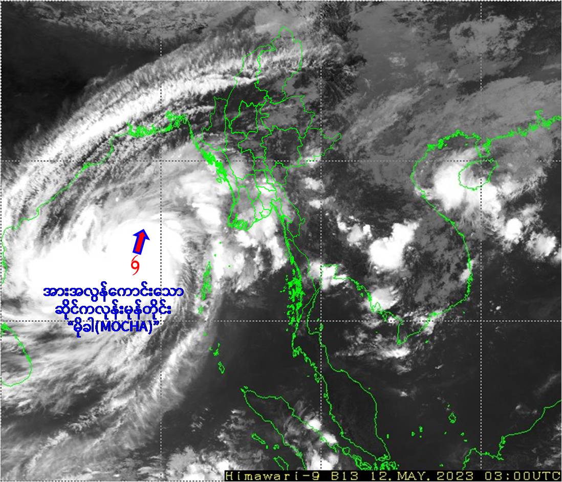 (၁) ယနေ့မြန်မာစံတော်ချိန် (၀၉:၃၀)နာရီအချိန် တိုင်းထွာချက်များအရ ဘင်္ဂလား ပင်လယ်အော်အရှေ့တောင်ပိုင်းနှင့် ယင်းနှင့်ဆက်စပ်လျက်ရှိသော ဘင်္ဂလားပင်လယ်အော်အလယ်ပိုင်းတွင် ဖြစ်ပေါ်နေသော အားကောင်းသောဆိုင်ကလုန်း မုန်တိုင်း(Severe Cyclonic Storm) “မိုခါ(MOCHA)”သည် မြောက်ယွန်းယွန်း သို့ ရွေ့လျားခဲ့ပြီး၊ ပိုမိုအားကောင်းလာကာ အားအလွန်ကောင်းသောဆိုင် ကလုန်းမုန်တိုင်း(Very Severe Cyclonic Storm) “မိုခါ(MOCHA)”အဖြစ်သို့ ရောက်ရှိခဲ့ပါသည်။ အဆိုပါ အားအလွန်ကောင်းသောဆိုင်ကလုန်းမုန်တိုင်း (Very Severe Cyclonic Storm) “မိုခါ (MOCHA)”သည် မြန်မာနိုင်ငံ၊ ကိုကိုးကျွန်းမြို့(Coco Island)၏ အနောက်-အနောက်တောင်ဘက် ရေမိုင် (၃၁၀)မိုင်ခန့်၊ ဟိုင်းကြီးကျွန်းမြို့(Hainggyigyun)၏ အနောက်တောင်ဘက် ရေမိုင်(၄၀၀)မိုင်ခန့်၊ စစ်တွေမြို့(Sittwe)၏ တောင်-အနောက်တောင်ဘက် ရေမိုင်(၄၉၅)မိုင်ခန့်၊ အိန္ဒိယနိုင်ငံ၊ ပို့ပလဲယား(Port Blair)၏ အနောက်-အနောက်မြောက်ဘက် ရေမိုင်(၂၉၀)မိုင်ခန့်နှင့် ဘင်္ဂလားဒေ့ရှ်နိုင်ငံ၊ ကော့ဘဇား မြို့(Cox’s Bazar)၏ တောင်-အနောက်တောင်ဘက် ရေမိုင်(၅၃၀)မိုင်ခန့် အကွာ ပင်လယ်ပြင်ကို ဗဟိုပြုနေပါသည်။