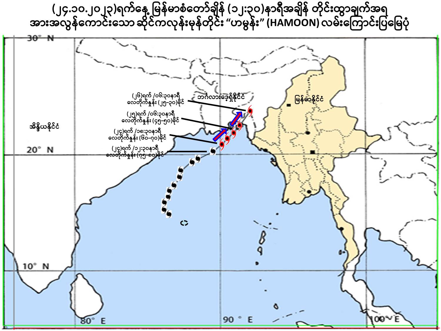 (၁) ယနေ့မြန်မာစံတော်ချိန် (၁၂:၃၀)နာရီအချိန် တိုင်းထွာချက်များအရ ဘင်္ဂလားပင်လယ်အော် အနောက်မြောက်ပိုင်းတွင် ဖြစ်ပေါ်နေသော အားကောင်းသော ဆိုင်ကလုန်းမုန်တိုင်း(Severe Cyclonic Storm)“ဟမွန်း”(HAMOON)သည် အရှေ့မြောက်ဘက်သို့ ရွေ့လျားခဲ့ပြီး၊ ပိုမိုအားကောင်းလာကာ ဘင်္ဂလား ပင်လယ်အော်အနောက်မြောက်ပိုင်းနှင့် ယင်းနှင့်ဆက်စပ်လျက်ရှိသော ဘင်္ဂလား ပင်လယ်အော်အရှေ့မြောက်ပိုင်းတို့တွင် အားအလွန်ကောင်းသောဆိုင်ကလုန်း မုန်တိုင်း(Very Severe Cyclonic Storm) “ဟမွန်း”(HAMOON)အဖြစ်သို့ ရောက်ရှိခဲ့ပါသည်။ အဆိုပါ အားအလွန်ကောင်းသော ဆိုင်ကလုန်းမုန်တိုင်း  “ဟမွန်း”(HAMOON)သည် မြန်မာနိုင်ငံ၊ သံတွဲမြို့(Thandwe)၏ အနောက်-အနောက်မြောက်ဘက် ရေမိုင် (၂၉၀)မိုင်ခန့်၊ စစ်တွေမြို့(Sittwe)၏ အနောက်ဘက် ရေမိုင် (၁၉၀) မိုင်ခန့်၊ မောင်တောမြို့ (Maungdaw)၏ အနောက် - အနောက်တောင်ဘက် ရေမိုင် (၁၇၀)မိုင်ခန့်၊ အိန္ဒိယနိုင်ငံ၊ ပါရာဒစ်မြို့ (Paradip)၏ အရှေ့ဘက် ရေမိုင် (၁၆၀)မိုင်ခန့်၊ ဒီဂါမြို့(Digha)၏ အရှေ့ တောင်ဘက် ရေမိုင်(၁၅၀)မိုင်ခန့်၊ ဘင်္ဂလားဒေရှ့်နိုင်ငံ၊ ခီပူပါရာမြို့ (Khepupara) ၏ တောင်-အနောက် တောင်ဘက် ရေမိုင် (၁၂၅) မိုင်ခန့်နှင့် စစ်တကောင်းမြို့(Chittagong)၏ အနောက်တောင်ဘက် ရေမိုင် (၁၉၀)မိုင်ခန့်အကွာ ပင်လယ်ပြင်ကို ဗဟိုပြုနေပါသည်။