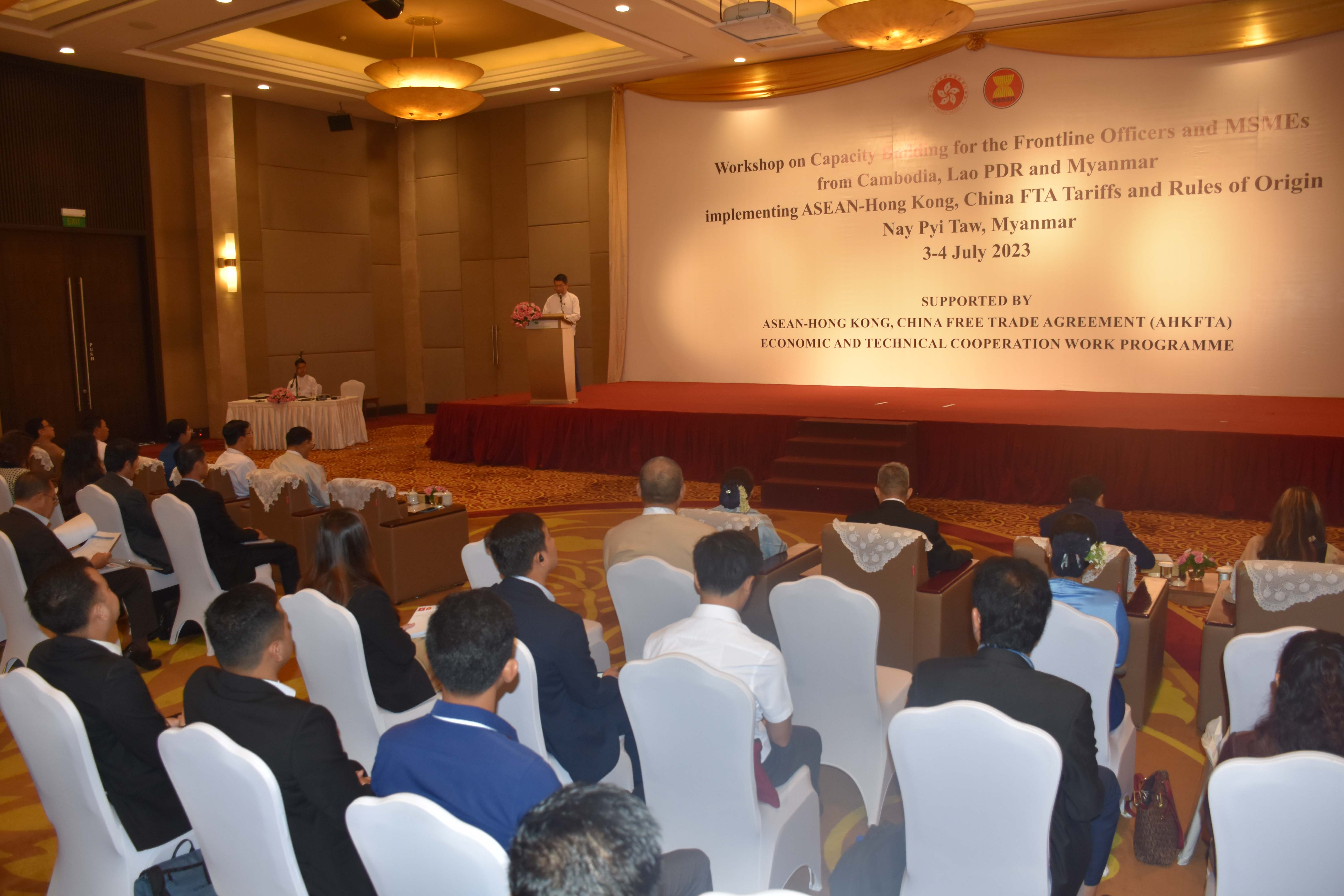 အာဆီယံ−ဟောင်ကောင်(တရုတ်) လွတ်လပ်သောကုန်သွယ်မှု သဘောတူစာချုပ်အရ ကျင့်သုံးသည့် အကောက်ခွန်နှုန်းထားနှင့် ပင်ရင်းနိုင်ငံစည်းမျဉ်းတို့ကို နားလည်သဘောပေါက်ခြင်းဖြင့် သဘောတူ စာချုပ်အရ အကောက်ခွန်သက်သာခွင့်ဆိုင်ရာ အကျိုးကျေးဇူးများကို ရရှိစေနိုင်မည်ဖြစ်ပါကြောင်း၊ ယင်းအခွင့် အရေးကိုရယူ၍ သက်ဆိုင်ရာအရာထမ်းများနှင့် ပုဂ္ဂလိကကဏ္ဍအနေဖြင့် ယခုအလုပ်ရုံဆွေးနွေးပွဲမှ အာဆီယံ−ဟောင်ကောင်(တရုတ်) လွတ်လပ်သော ကုန်သွယ်မှုသဘောတူစာချုပ်ကို ထိရောက်အကျိုးရှိစွာ အကောင်အထည်ဖော် အသုံးချသွားရန် တိုက်တွန်းပါကြောင်း ပြောကြားသည်။