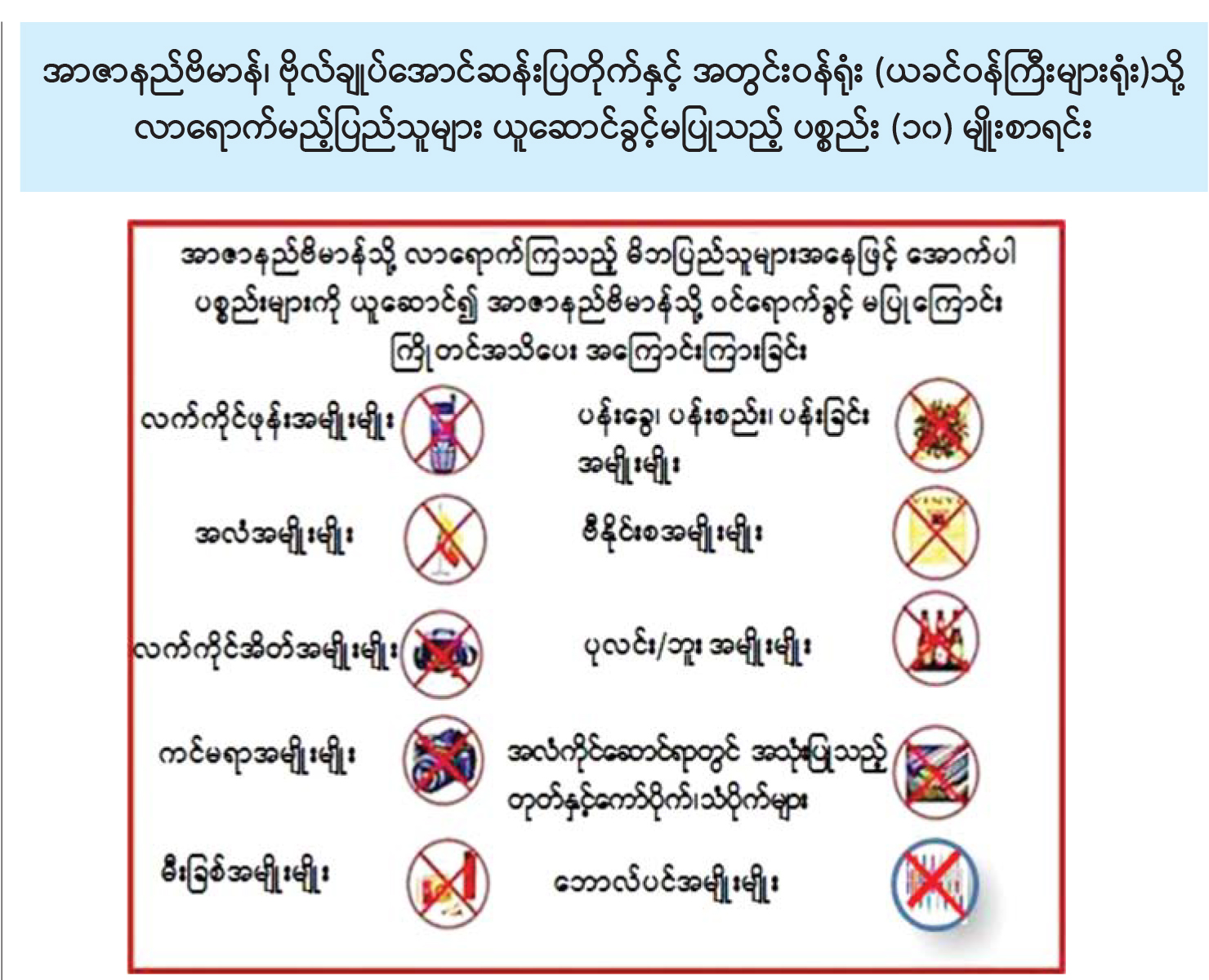 အာဇာနည်ဗိမာန်၊ ဗိုလ်ချုပ်အောင်ဆန်းပြတိုက်နှင့် အတွင်းဝန်ရုံး (ယခင်ဝန်ကြီးများရုံး)သို့ လာရောက်မည့်ပြည်သူများ ယူဆောင်ခွင့်မပြုသည့် ပစ္စည်း(၁၀)မျိုးစာရင်း