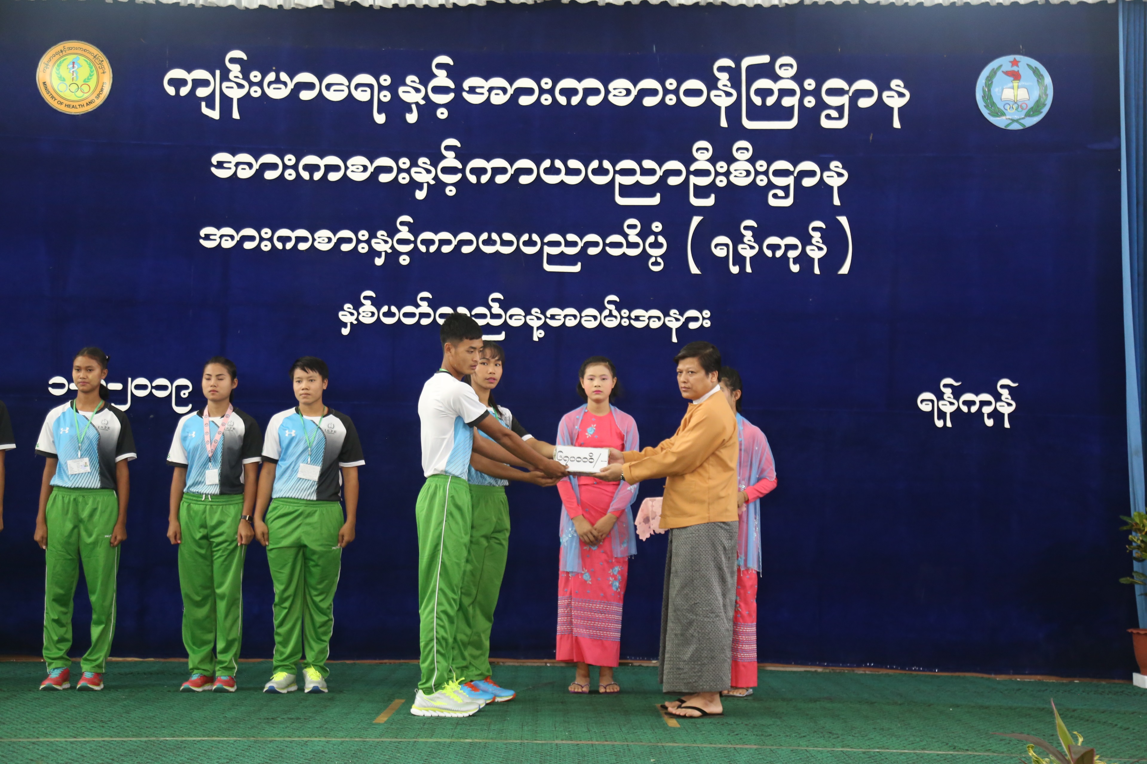 ရှေးဦးစွာ ရန်ကုန်တိုင်းဒေသကြီးလူမှုရေးဝန်ကြီး ဦးနိုင်ငံလင်းက အမှာစကားပြောကြားသည်။ ဆက်လက်၍ လူမှုရေးဝန်ကြီး ဦးနိုင်ငံလင်း၊ တိုင်းဒေသကြီးလွှတ်တော် ဒုတိယဥက္ကဋ္ဌ ဦးလင်းနိုင်မြင့်၊ တိုင်းဒေသကြီး လွှတ်တော်ကိုယ်စားလှယ်များ၊ကျန်းမာရေးနှင့်အားကစာဝန်ကြီးဌာန ဒုတိယ အမြဲတန်းအတွင်းဝန် ဦးမြသန်းထိုက်၊ မြန်မာနိုင်ငံအားကစားအဖွဲ့ချုပ် အလုပ်အမှုဆောင် ရွေးချယ်တင်မြှောက်ကျင်းပရေးကော်မရှင်အဖွဲ့ဝင်များ၊ မြန်မာနိုင်ငံအားကစားအဖွဲချုပ်မှ ဥက္ကဋ္ဌများက ဝန်ကြီးဌာန/ဥက္ကဋ္ဌဖလားနှင့် တိုင်းဒေသကြီးနှင့်ပြည်နယ်အိုလံပစ်နေ့နှင့် ကျောင်းပြိုင်ပွဲများတွင် အားကစားနည်းအလိုက် ဆုရရှိကြသည့် အားကစားသမားများအား ဂုဏ်ပြုဆုချီးမြင့်ကြပြီး အားကစားနှင့်ကာယပညာသိပ္ပံ(ရန်ကုန်) ကျောင်းအုပ်ကြီး ဦးစိုးအောင်က ဝန်ထမ်းများအား ဝတ်စုံများ ပေးအပ်ချီးမြှင့်ကြသည်။