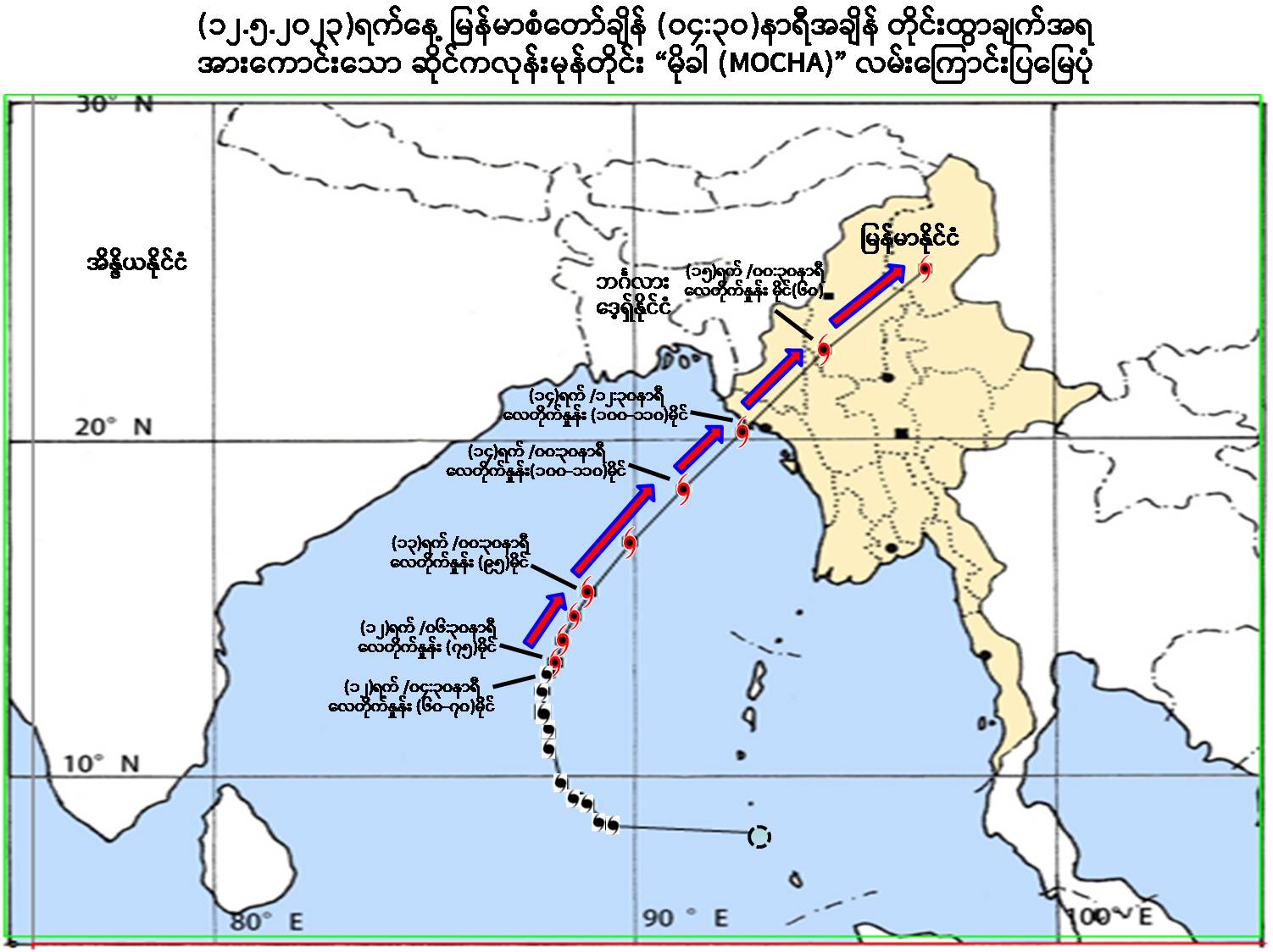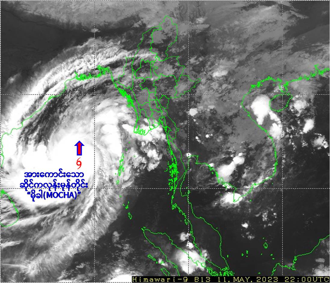 (၁) ယနေ့မြန်မာစံတော်ချိန် (၀၄:၃၀)နာရီအချိန် တိုင်းထွာချက်များအရ ဘင်္ဂလား ပင်လယ်အော်အရှေ့တောင်ပိုင်းတွင် ဖြစ်ပေါ်နေသော အားကောင်းသော ဆိုင်ကလုန်းမုန်တိုင်း (Severe Cyclonic Storm) “မိုခါ(MOCHA)” သည် မြောက်ယွန်းယွန်းသို့ ရွေ့လျားခဲ့ပြီး၊ မြန်မာနိုင်ငံ၊ ကိုကိုးကျွန်းမြို့(Coco Island)၏ အနောက်-အနောက်တောင်ဘက် ရေမိုင်(၃၂၀)မိုင်ခန့်၊ ဟိုင်းကြီး ကျွန်းမြို့ (Hainggyigyun)၏ အနောက်တောင်ဘက် ရေမိုင်(၄၁၅)မိုင်ခန့်၊ စစ်တွေမြို့ (Sittwe)၏ တောင်- အနောက်တောင်ဘက် ရေမိုင်(၅၂၀)မိုင်ခန့်၊ အိန္ဒိယနိုင်ငံ၊ ပို့ပလဲယား(Port Blair)၏ အနောက်- အနောက်မြောက်ဘက် ရေမိုင်(၂၉၀)မိုင်ခန့်နှင့် ဘင်္ဂလားဒေ့ရှ်နိုင်ငံ၊ ကော့ဘဇားမြို့(Cox’s Bazar)၏ တောင်-အနောက်တောင်ဘက် ရေမိုင်(၅၆၅)မိုင်ခန့်အကွာ ပင်လယ်ပြင်ကို ဗဟိုပြုနေပါသည်။