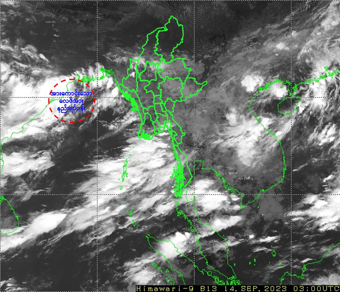 "ယနေ့မြန်မာစံတော်ချိန် (၀၉:၃၀)နာရီအချိန် တိုင်းထွာချက်များအရ ဘင်္ဂလားပင်လယ်အော် အနောက်မြောက်ပိုင်းနှင့် ယင်းနှင့်ဆက်စပ်လျက်ရှိသော ဘင်္ဂလားပင်လယ်အော်အနောက် အလယ်ပိုင်းတို့တွင် ဖြစ်ပေါ်နေသော လေဖိအားနည်းရပ်ဝန်း(Low Pressure Area)သည် အားကောင်းသောလေဖိအားနည်းရပ်ဝန်း(Well Marked Low Pressure Area)အဖြစ်သို့ ရောက်ရှိခဲ့ပြီး၊ ဘင်္ဂလားပင်လယ်အော်အနောက်မြောက်ပိုင်း (အိန္ဒိယနိုင်ငံ၊ ဩရိဿပြည်နယ် မြောက်ပိုင်းကမ်းလွန်- အနောက်ဘင်္ဂလားပြည်နယ်ကမ်းခြေ)တို့တွင် ဆက်လက်တည်ရှိနေ ပါသည်။ အဆိုပါ အားကောင်းသောလေဖိအားနည်းရပ်ဝန်း(Well Marked Low Pressure Area)သည် နောက်(၂၄)နာရီအတွင်း အိန္ဒိယနိုင်ငံ၊ ဩရိဿပြည်နယ်ကို ဖြတ်ကျော်နိုင်သည်ဟု ခန့်မှန်းရပါသည်။"