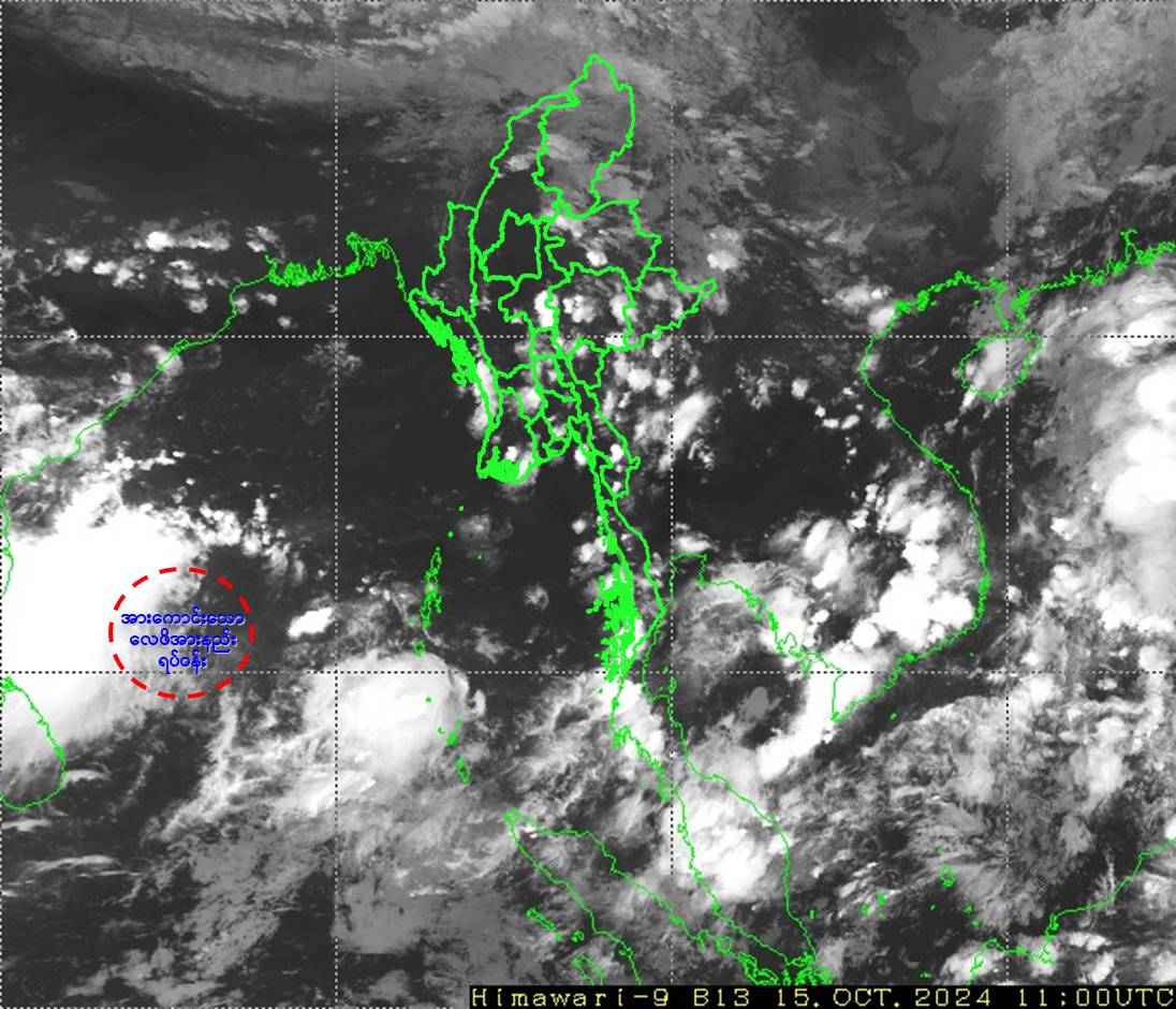 မိုးလေဝသနှင့်ဇလဗေဒ ညွှန်ကြားမှုဦးစီးဌာနက ယနေ့ည ၇ နာရီ ထုတ်ပြန်သည့် မိုးလေဝသသတင်းအရ ဘင်္ဂလား ပင်လယ်အော်တောင်ပိုင်းတွင် ဖြစ်ပေါ်နေသော အားကောင်းသော လေဖိအားနည်းရပ်ဝန်း (Well Marked Low Pressure Area) သည် အနောက်-အနောက်မြောက်ဘက်သို့ ရွေ့လျားခဲ့ပြီး၊ ဘင်္ဂလားပင်လယ်အော် အနောက်တောင်ပိုင်းနှင့် ယင်းနှင့် ဆက်စပ်လျက်ရှိသော ဘင်္ဂလားပင်လယ်အော် အရှေ့တောင်ပိုင်းတို့တွင် ဆက်လက်တည်ရှိနေသည်။ အဆိုပါ အားကောင်းသော လေဖိအားနည်းရပ်ဝန်းသည် အနောက်-အနောက်မြောက်ဘက်သို့ ဆက်လက်ရွေ့လျားနိုင်ပြီး၊ နောက် (၁၂) နာရီ အတွင်း ဘင်္ဂလားပင်လယ်အော် အနောက်တောင်ပိုင်းတွင် မုန်တိုင်းငယ် (Depression) အဖြစ်သို့ ပိုမိုအားကောင်းလာနိုင်ကာ၊ ၁၇-၁၀-၂၀၂၄ ရက်နေ့နံနက်ပိုင်းတွင် အိန္ဒိယနိုင်ငံ၊ တမီးနာဒူးလ် မြောက်ပိုင်းနှင့် ယင်းနှင့်ဆက်စပ်လျက်ရှိသော အင်ဒရာပရာဒေ့ရှ် တောင်ပိုင်းကမ်းခြေတို့သို့ ရောက်ရှိနိုင်သည်ဟု ခန့်မှန်းရသည်။ အနောက်တောင်မုတ်သုံလေသည် မြန်မာနိုင်ငံတစ်ဝန်းလုံးမှ ဆုတ်ခွာခဲ့ပြီးဖြစ်သည်။ ကပ္ပလီပင်လယ်ပြင်တောင်ပိုင်း၊ ဘင်္ဂလားပင်လယ်အော်တောင်ပိုင်းနှင့် အနောက်အလယ်ပိုင်းတို့တွင် တိမ်အသင့်အတင့်မှ တိမ်ထူထပ်နေပြီး၊ ကပ္ပလီပင်လယ်ပြင် မြောက်ပိုင်းနှင့် ကျန်ဘင်္ဂလားပင်လယ်အော်တို့တွင် တိမ်အနည်းငယ် ဖြစ်ထွန်းနေသည်။