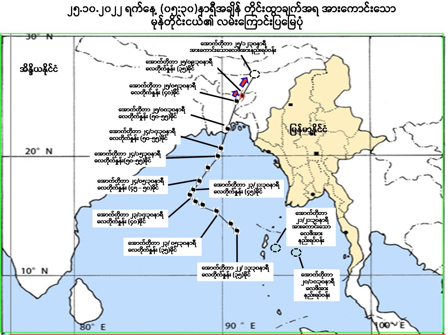 ယနေ့မြန်မာစံတော်ချိန် (၀၅:၃၀) နာရီ တိုင်းထွာချက်များအရ ဘင်္ဂလားဒေ့ရှ် နိုင်ငံကမ်းခြေကို တင်ကိုနာကျွန်း (Tinkona Island) နှင့် ဆန်းဝစ်(ပ်)ကျွန်း (SandwipIsland) တို့အကြားမှ ဖြတ်ကျော်ဝင်ရောက်ခဲ့သော ဆိုင်ကလုန်းမုန်တိုင်း (Cyclonic Storm) “စီတရန်(SITRANG)”သည် အားကောင်းသော မုန်တိုင်းငယ် (Deep Depression) အဖြစ်သို့အားလျော့သွားခဲ့ပြီး၊ မြောက်-အရှေ့မြောက်ဘက်သို့ ဆက်လက်ရွေ့လျားလျက်ရှိသည်။