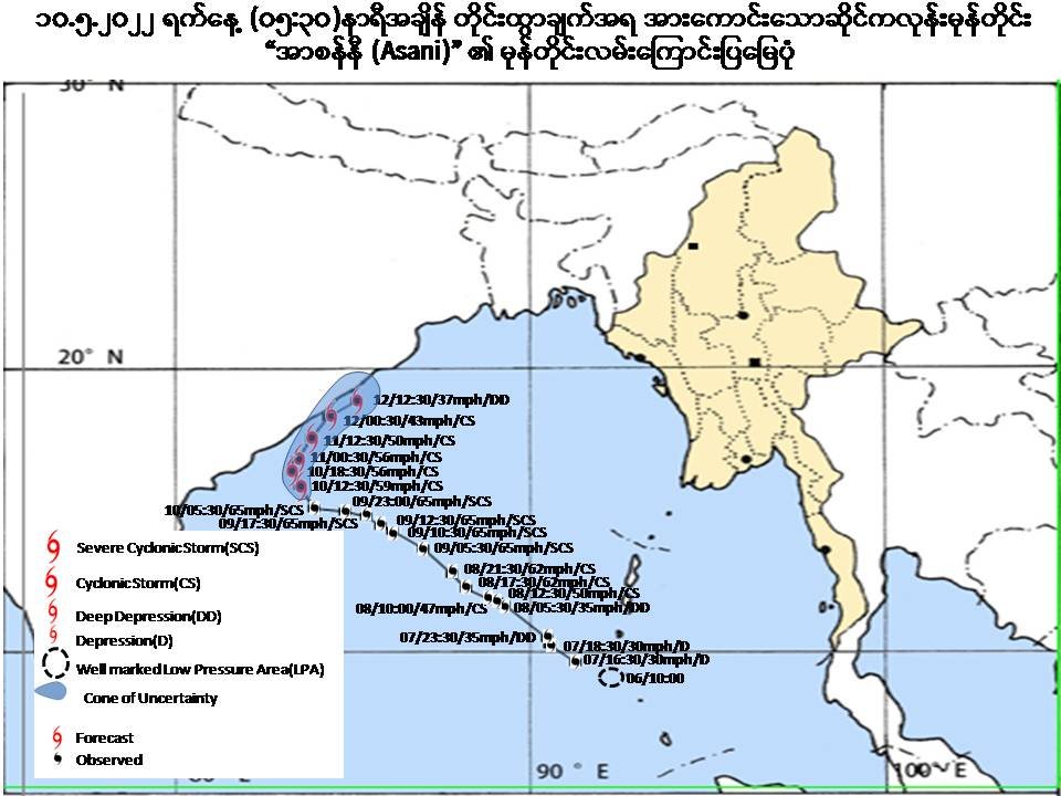 ယနေ့မြန်မာစံတော်ချိန် (၀၅:၃၀) နာရီ တိုင်းထွာချက်များအရ ဘင်္ဂလားပင်လယ်အော် အနောက်အလယ်ပိုင်းတွင် ဖြစ်ပေါ်နေသော အားကောင်းသောဆိုင်ကလုန်းမုန်တိုင်း (Severe Cyclonic Storm) “အာစန်နီ(Asani)” သည် အနောက်-အနောက်မြောက်ဘက်သို့ ရွေ့လျားခဲ့ပြီး၊ အိန္ဒိယနိုင်ငံ၊ ကာကီနာဒါမြို့ (Kakinada) ၏ အရှေ့တောင်ဘက် ရေမိုင် (၁၆၀) မိုင်ခန့်၊ ဗီဆာကာပတ္တနမ်မြို့ (Vishakhapatnam) ၏ တောင်-အရှေ့တောင်ဘက် ရေမိုင် (၁၈၀) မိုင်ခန့်၊ ဂိုလ်ပါပူမြို့ (Gopalpur) ၏ တောင်-အနောက်တောင်ဘက် ရေမိုင် (၂၇၀) မိုင်ခန့်၊ ပူရီမြို့ (Puri) ၏ တောင်-အနောက်တောင်ဘက် ရေမိုင် (၃၂၀) မိုင်ခန့်၊ မြန်မာနိုင်ငံ၊ ကိုကိုးကျွန်းမြို့ (Coco Island) ၏ အနောက်-အနောက်မြောက် ဘက် ရေမိုင် (၅၅၀) မိုင်ခန့်နှင့် ဟိုင်းကြီးကျွန်းမြို့ (Hainggyikyun) ၏ အနောက်-အနောက်တောင်ဘက် ရေမိုင် (၆၁၀) မိုင်ခန့် အကွာပင်လယ်ပြင်ကို ဗဟိုပြုနေသည်။
