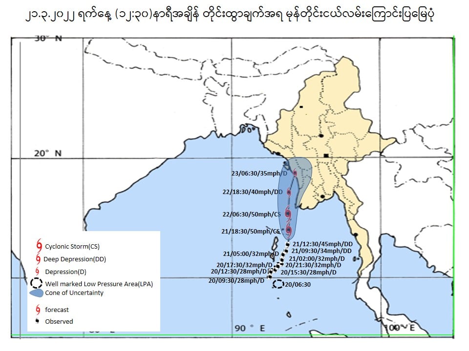 (၅) (၂၃.၃.၂၀၂၂)ရက်နေ့ နံနက်ပိုင်းတွင် ရခိုင်ကမ်းရိုးတန်းသို့ရောက်ရှိနိုင်ပြီး အမြင့်ဆုံး လေတိုက်နှုန်းမှာ တစ်နာရီလျှင် မိုင်(၄၀)မှ (၄၅)မိုင်အထိ တိုက်ခတ် နိုင်သည်ဟု ခန့်မှန်းရသည်။