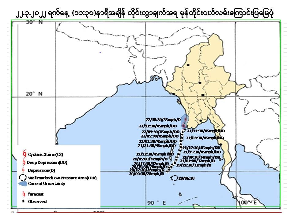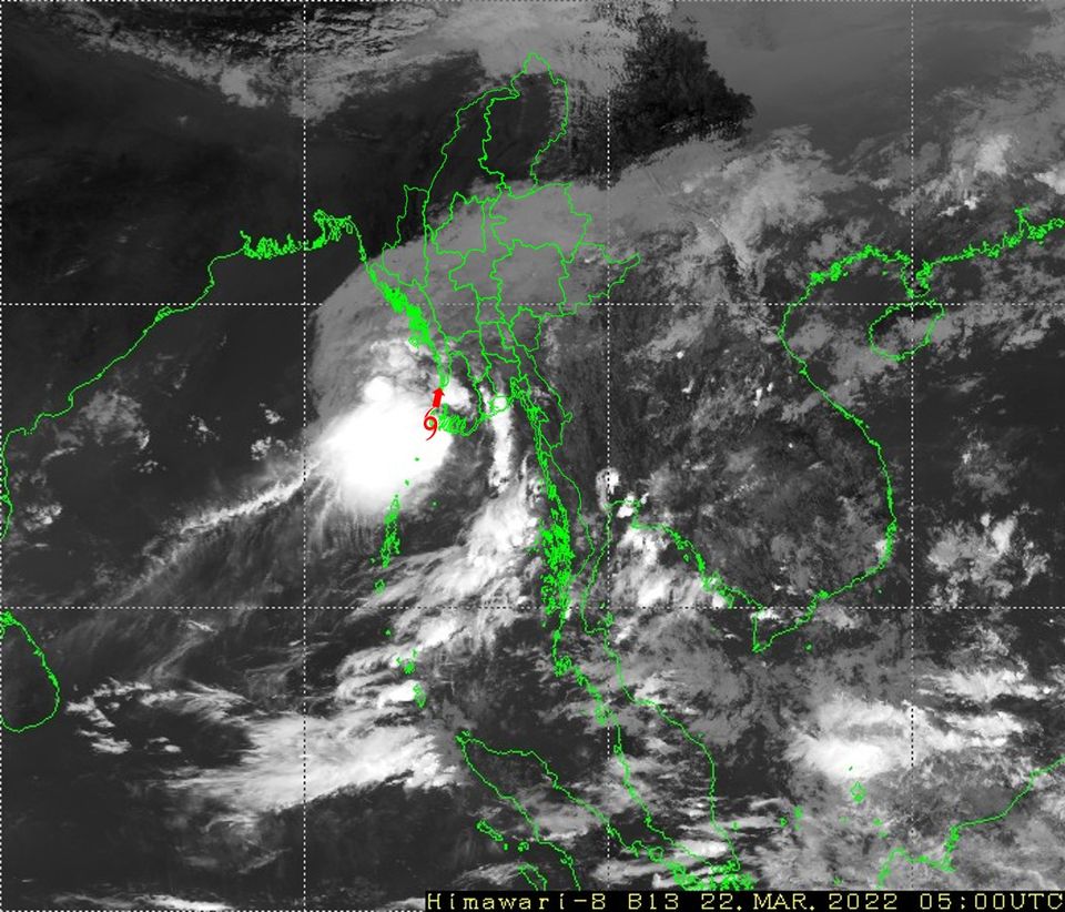 (၁)       အားကောင်းသောမုန်တိုင်းငယ်(Deep Depression)၏အရှိန်ကြောင့် ယနေ့မွန်းလွဲမှ (၂၃.၃.၂၀၂၂)ရက်နေ့အတွင်း နေပြည်တော်၊ စစ်ကိုင်းတိုင်းဒေသကြီးအောက်ပိုင်း၊ မန္တလေးတိုင်း ဒေသကြီး၊ မကွေးတိုင်းဒေသကြီး၊ ပဲခူးတိုင်းဒေသကြီး၊ ရန်ကုန်တိုင်းဒေသကြီး၊ ဧရာဝတီတိုင်းဒေသကြီး၊ တနင်္သာရီတိုင်းဒေသကြီး၊ ရှမ်းပြည်နယ်၊ ချင်းပြည်နယ်၊ ရခိုင်ပြည်နယ်၊ ကယားပြည်နယ်၊ ကရင်ပြည်နယ်နှင့် မွန်ပြည်နယ်တို့တွင် နေရာစိပ်စိပ်မှ နေရာအနှံ့အပြား မိုးထစ်ချုန်းရွာပြီး အချို့ဒေသများတွင် ဒေသအလိုက်နှင့် နေရာကွက်၍ မိုးကြီးနိုင်သည်။