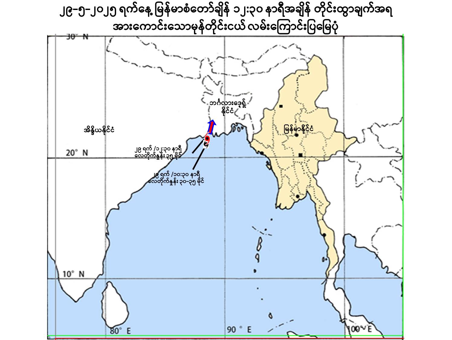 (၁) ယနေ့မြန်မာစံတော်ချိန် ၁၂:၃၀ နာရီအချိန် တိုင်းထွာချက်များအရ ဘင်္ဂလားအော် အနောက်မြောက်ပိုင်း (အိန္ဒိယနိုင်ငံ၊ အနောက်ဘင်္ဂလားပြည်နယ်-ဘင်္ဂလားဒေ့ရှ်နိုင်ငံကမ်းခြေ) တွင် ဖြစ်ပေါ်နေသော မုန်တိုင်းငယ် (Depression) သည် မြောက်ယွန်းယွန်းသို့ ရွေ့လျားခဲ့ပြီး၊ ပိုမိုအားကောင်းလာကာ အားကောင်းသောမုန်တိုင်းငယ် (Deep Depression) အဖြစ်သို့ ရောက်ရှိခဲ့ပါသည်။ အဆိုပါ အားကောင်းသောမုန်တိုင်းငယ်သည် မြန်မာနိုင်ငံ၊ စစ်တွေမြို့ (Sittwe) ၏ အနောက်-အနောက်မြောက်ဘက် ရေမိုင် ၂၅၀ မိုင်ခန့်၊ အိန္ဒိယနိုင်ငံ၊ ဆာဂါကျွန်း (Sagar Island) ၏ အရှေ့တောင်ဘက် ရေမိုင် ၃၅ မိုင်ခန့်၊ ဒီဂါမြို့(Degha)၏ အရှေ့-အရှေ့တောင်ဘက် ရေမိုင် ၆၀ မိုင်ခန့်၊ ဘင်္ဂလားဒေ့ရှ်နိုင်ငံ၊ ခီပူပါရာမြို့ (Khepupara) ၏ အနောက်-အနောက်တောင်ဘက် ရေမိုင် ၁၀၅ မိုင်ခန့်အကွာ ပင်လယ်ပြင်ကို ဗဟိုပြုနေပါသည်။ ဗဟိုချက်လေဖိအား ၉၈၈ ဟက်တိုပါစကယ်နှင့် အမြင့်ဆုံးလေတိုက်နှုန်းမှာ တစ်နာရီလျှင် ၃၅ မိုင်နှုန်းခန့် ဖြစ်ပါသည်။