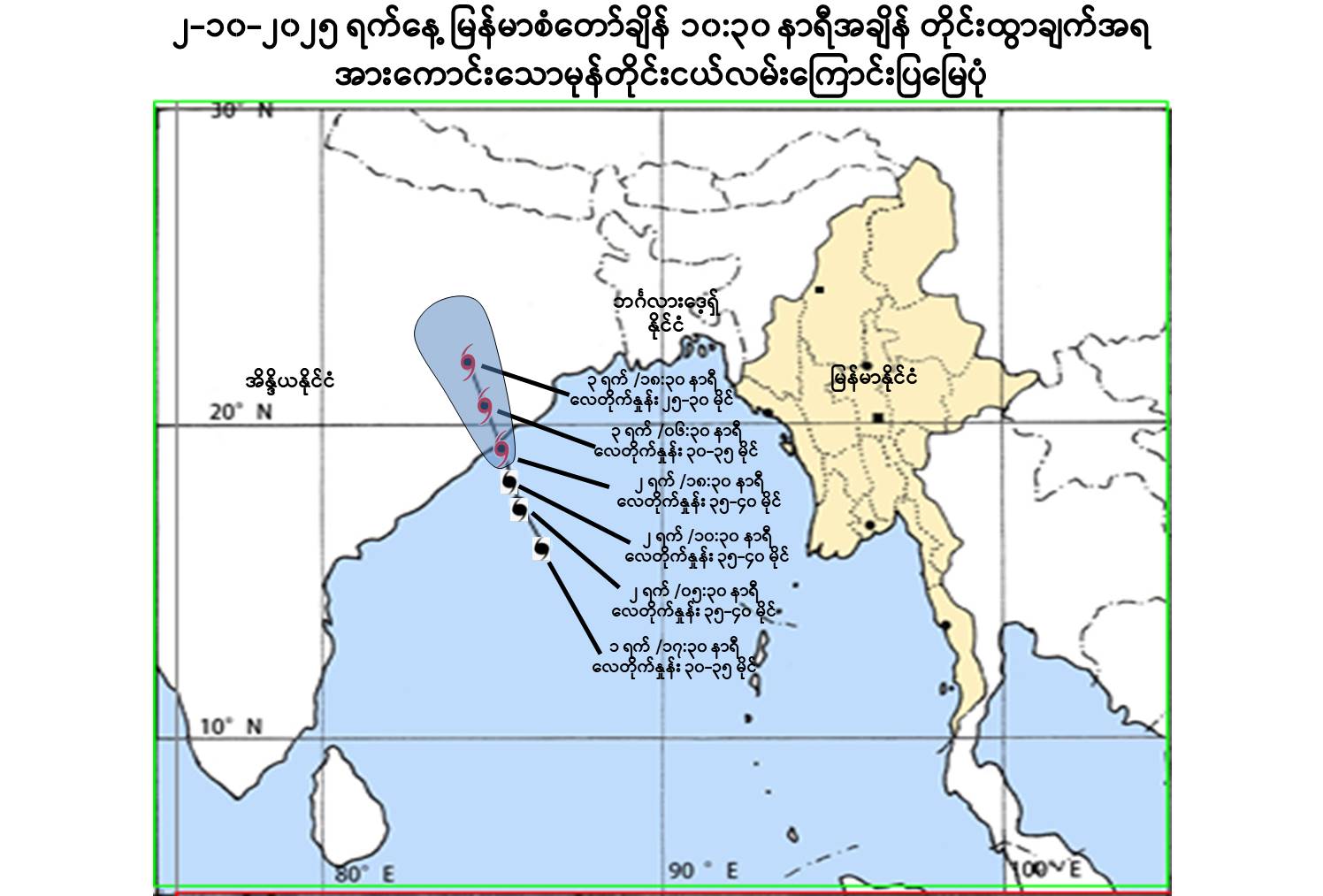 (၁) ယနေ့မြန်မာစံတော်ချိန် ၁၀:၃၀ နာရီအချိန် တိုင်းထွာချက်များအရ ဘင်္ဂလားပင်လယ်အော် အနောက်အလယ်ပိုင်းနှင့် ယင်းနှင့်ဆက်စပ်လျက်ရှိသော ဘင်္ဂလားပင်လယ်အော် အနောက်မြောက်ပိုင်းတို့တွင် ဖြစ်ပေါ်နေသော အားကောင်းသောမုန်တိုင်းငယ် (Deep Depression) သည် မြောက်-အနောက်မြောက်ဘက်သို့ ရွေ့လျားခဲ့ပြီး မြန်မာနိုင်ငံ၊ စစ်တွေမြို့ (Sittwe) ၏ အနောက်-အနောက်တောင်ဘက် ရေမိုင် ၄၃၅ မိုင်ခန့်၊ အိန္ဒိယနိုင်ငံ၊ ပူရီမြို့ (Puri) ၏ တောင်-အနောက်တောင်ဘက် ရေမိုင် ၁၀၅ မိုင်ခန့်၊ ဂိုလ်ပါပူမြို့ (Gopalpur) ၏ တောင်-အရှေ့တောင်ဘက် ရေမိုင် ၈၀ မိုင်ခန့်နှင့် ပါရာဒစ်ပ်မြို့ (Paradip) ၏ တောင်-အနောက်တောင်ဘက် ရေမိုင် ၁၄၅ မိုင်ခန့်အကွာ ပင်လယ်ပြင်ကို ဗဟိုပြုနေပါသည်။
