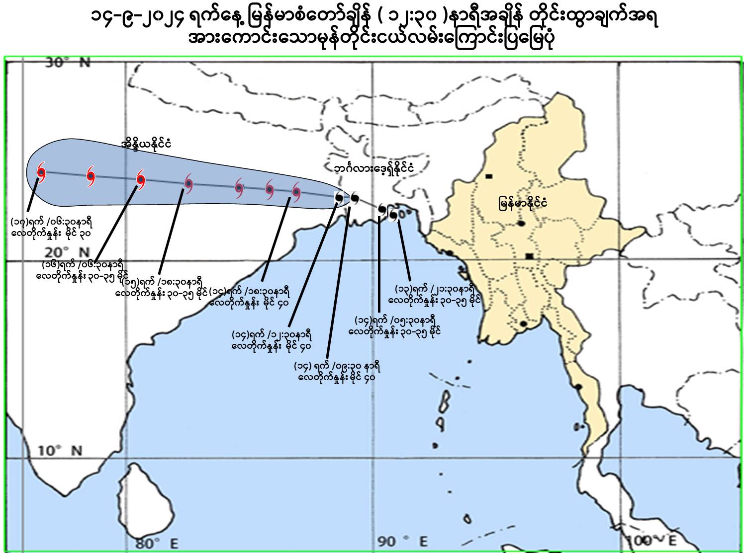 ယနေ့မြန်မာစံတော်ချိန် (၁၂:၃၀)နာရီအချိန် တိုင်းထွာချက်များအရ အိန္ဒိယနိုင်ငံ၊ အနောက်ဘင်္ဂလားပြည်နယ်နှင့် ယင်းနှင့်ဆက်စပ်လျက်ရှိသော ဘင်္ဂလားဒေ့ရှ်နိုင်ငံတို့တွင် ဖြစ်ပေါ်နေသော အားကောင်းသောမုန်တိုင်းငယ် (Deep Depression) သည် သိသိသာသာရွေ့လျားခြင်းမရှိဘဲ ဆက်လက်တည်ရှိနေပါသည်။