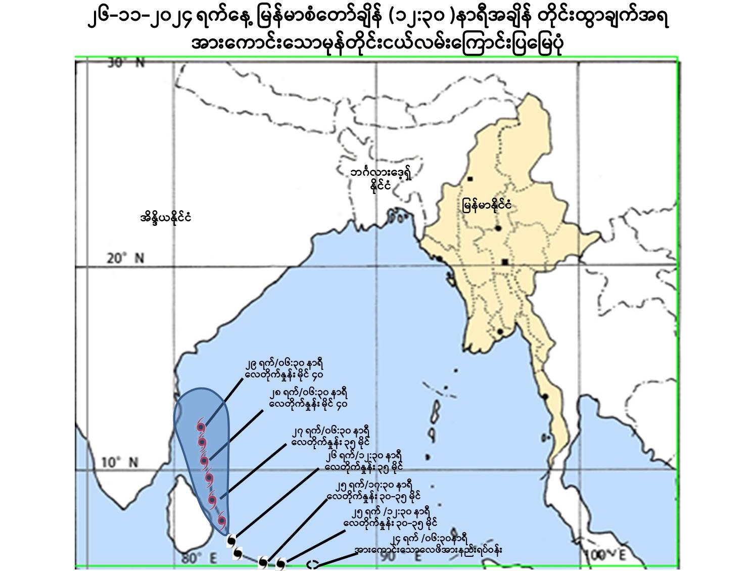 (၁) ယနေ့မြန်မာစံတော်ချိန် (၁၂:၃၀)နာရီအချိန် တိုင်းထွာချက်များအရ ဘင်္ဂလားပင်လယ်အော်အနောက်တောင်ပိုင်းတွင် ဖြစ်ပေါ်နေသော မုန်တိုင်းငယ် (Depression)သည် မြောက်-အနောက်မြောက်ဘက်သို့ရွေ့လျားခဲ့ပြီး၊ ပိုမိုအားကောင်းလာကာ အားကောင်းသောမုန်တိုင်းငယ် (Deep Depression) အဖြစ်သို့ ရောက်ရှိခဲ့ပြီး၊ မြန်မာနိုင်ငံ၊ ကိုကိုးကျွန်းမြို့ (Coco Island) ၏ အနောက်တောင်ဘက် ရေမိုင် ၇၈၀ မိုင်ခန့်၊ အိန္ဒိယနိုင်ငံ၊ ချင်းနိုင်မြို့ (Chennai) ၏ တောင်-အရှေ့တောင်ဘက် ရေမိုင် ၄၃၀ မိုင်ခန့်အကွာ ပင်လယ်ပြင်ကို ဗဟိုပြုနေပါသည်။ ဗဟိုချက်လေဖိအား ၁၀၀၂ ဟက်တိုပါစကယ်နှင့် အမြင့်ဆုံးလေတိုက်နှုန်းမှာ တစ်နာရီလျှင် ၃၅ မိုင်နှုန်းခန့် ဖြစ်ပါသည်။