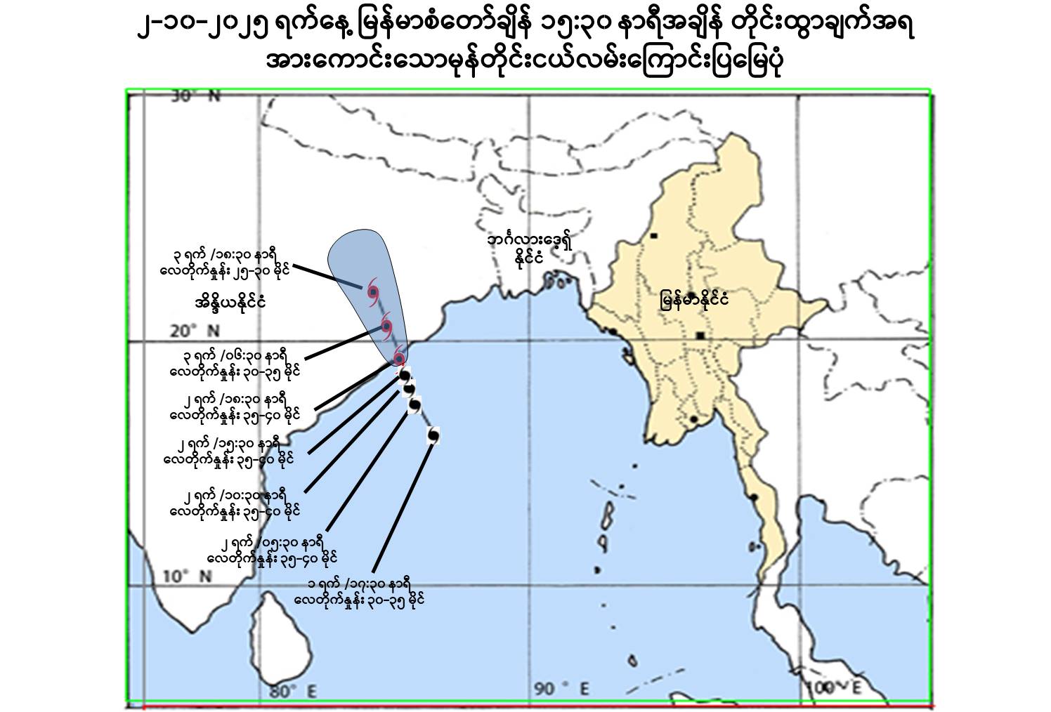 (၂) အားကောင်းသောမုန်တိုင်းငယ်၏ လက်ရှိအခြေအနေမှာ မြန်မာနိုင်ငံဘက်သို့ ဦးတည်ရွေ့လျားမည့် အခြေအနေမရှိပါသဖြင့် အဝါရောင်အဆင့်ဟု သတ်မှတ် ပါသည်။
