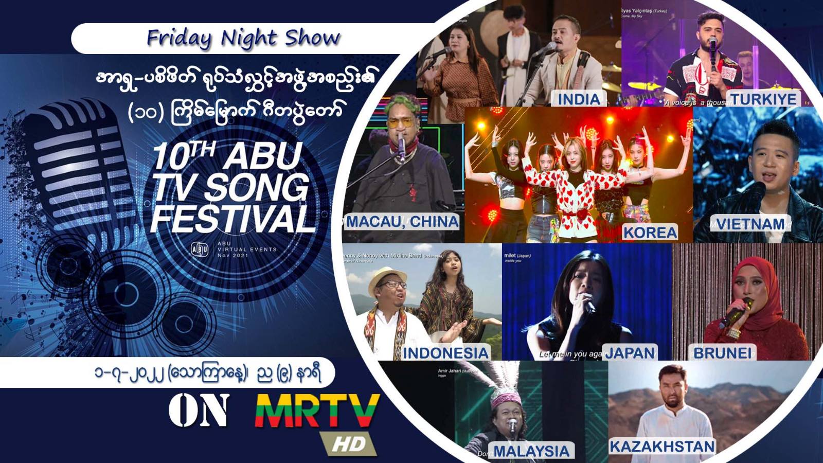 ပြည်သူများ အပန်းပြေစေရန်၊ ပျော်ရွှင်စေရန်နှင့် စိတ်ခွန်အားသစ်များ ရရှိနိုင်ရန် အတွက် မြန်မာ့အသံနှင့်ရုပ်မြင်သံကြားမှ ဖျော်ဖြေရေးအစီအစဉ်များကို တိုးမြှင့်တင်ဆက် လျက်ရှိရာ Friday Night Show ဆန်းသစ်တင်ဆက်မှုအဖြစ် “အာရှ-ပစိဖိတ်ဒေသတွင်း ရုပ်သံလွှင့် အဖွဲ့အစည်း၏ (၁၀) ကြိမ်မြောက် ဂီတပွဲတော် ” (10th ABU TV SONG FESTIVAL) ဖျော်ဖြေမှုကို ဇူလိုင် ၁ ရက် ၊ သောကြာနေ့ ည(၈)နာရီ သတင်းအပြီးတွင် မြန်မာ့အသံနှင့် ရုပ်မြင်သံကြား၏ MRTV-HD Channel မှ ထုတ်လွှင့်ပြသမည်ဖြစ်သည်။