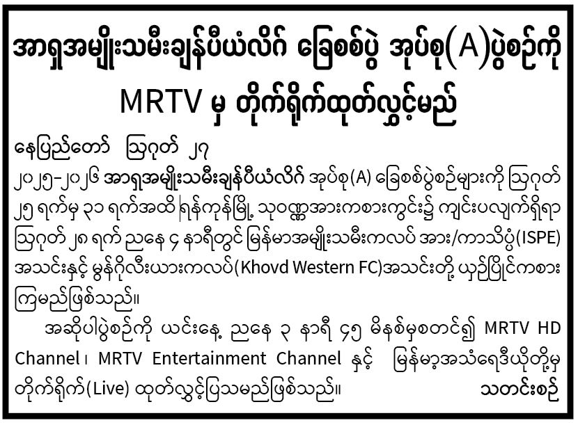 အာရှအမျိုးသမီးချန်ပီယံလိဂ် ခြေစစ်ပွဲ အုပ်စု(A)ပွဲစဉ်ကို MRTV မှ တိုက်ရိုက်ထုတ်လွှင့်မည်