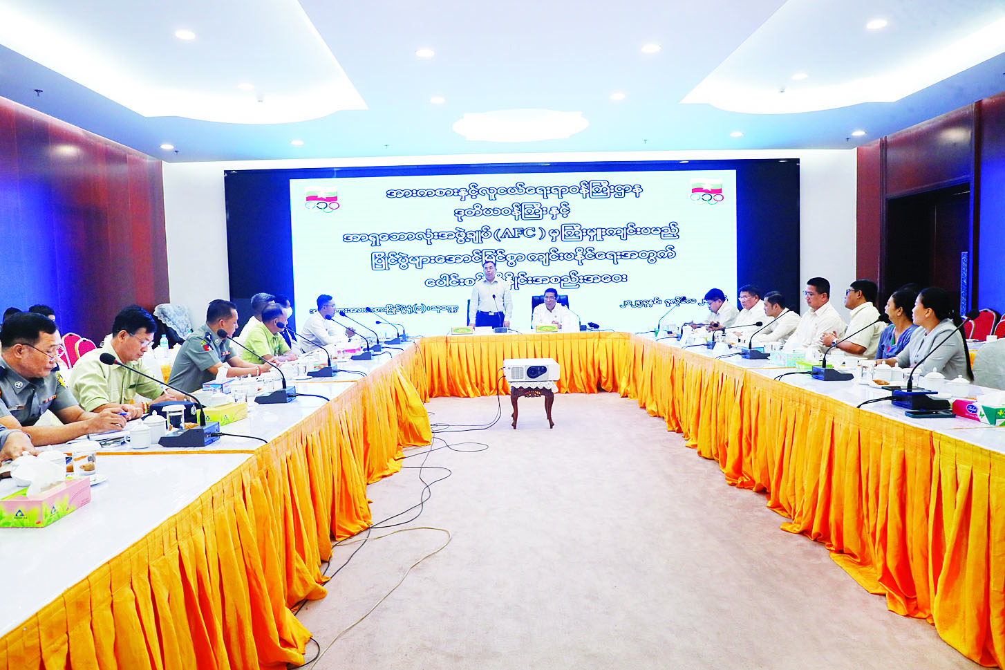 အစည်းအဝေးတွင် ဒုတိယဝန်ကြီးက မြန်မာနိုင်ငံအနေဖြင့် ဩဂုတ်လအတွင်း အာရှဘောလုံးအဖွဲ့ချုပ် (AFC) က ကြီးမှူးကျင်းပမည့် ဘောလုံးပြိုင်ပွဲ လေးမျိုးကို အိမ်ရှင်အဖြစ် လက်ခံကျင်းပသွားမည် ဖြစ်၍ အဆိုပါပြိုင်ပွဲများ အောင်မြင်စွာ ကျင်းပပြုလုပ်နိုင်ရေးအတွက် လုံခြုံရေး၊ သွားလာနေထိုင် စားသောက်ရေး၊ အုပ်ချုပ်မှုနှင့် ယာဉ်လမ်းကြောင်းပိတ်ဆို့မှုများ မဖြစ်ပေါ်စေရေးတို့ကို သက်ဆိုင်ရာ ဌာနများက အလေးထားဆောင်ရွက်ပေးစေလိုကြောင်း၊ ထို့ပြင် ပြိုင်ပွဲများ အောင်မြင်စွာ လက်ခံကျင်းပနိုင်ရေးအတွက် ရန်ကုန်တိုင်းဒေသကြီးအစိုးရအဖွဲ့၊ သက်ဆိုင်ရာဝန်ကြီးဌာနများ၊ မြန်မာနိုင်ငံဘောလုံးအဖွဲ့ချုပ်တို့က ဝိုင်းဝန်းကူညီပံ့ပိုးပြီး ပူးပေါင်းညှိနှိုင်းဆောင်ရွက်ပေး စေလိုကြောင်း ပြောကြားသည်။