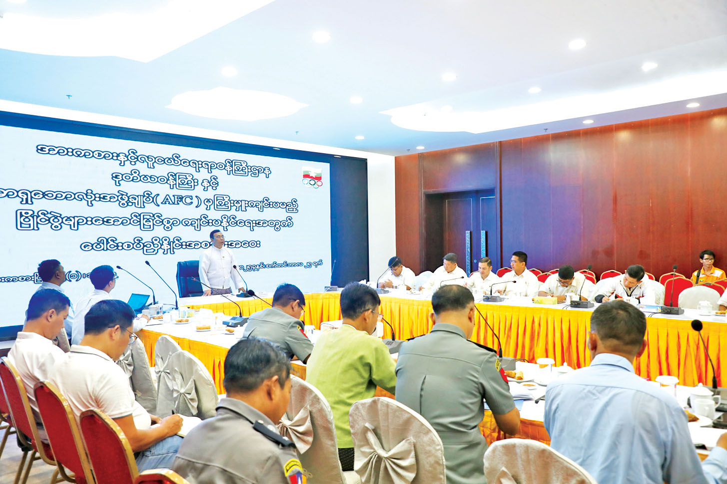 အာရှဘောလုံးအဖွဲ့ချုပ်(AFC) မှ ကြီးမှူးကျင်းပမည့် နိုင်ငံတကာဘောလုံးပြိုင်ပွဲများ၏ ပွဲစဉ်များကို အိမ်ရှင်အဖြစ် အောင်မြင်စွာ လက်ခံကျင်းပနိုင်ရေး ပေါင်းစပ်ညှိနှိုင်းအစည်းအဝေးကို ယနေ့ နံနက် ၉ နာရီတွင် ရန်ကုန်မြို့ ဝေဇယန္တာလမ်းရှိ အမျိုးသား အားကစားပြိုင်ပွဲရုံ(၁) သုဝဏ္ဏ ပတ္တမြားခန်းမ၌ကျင်းပရာ မြန်မာနိုင်ငံ အိုလံပစ်ကော်မတီ ဒုတိယဥက္ကဋ္ဌ အားကစားနှင့် လူငယ်ရေးရာဝန်ကြီးဌာန ဒုတိယဝန်ကြီး ဦးထိန်လင်း၊ ဒုတိယအမြဲတမ်းအတွင်းဝန်၊ အားကစားနှင့် ကာယပညာဦးစီးဌာန ဒုတိယညွှန်ကြားရေးမှူးချုပ်နှင့် တာဝန်ရှိသူများ၊ မြန်မာနိုင်ငံ ဘောလုံးအဖွဲ့ ချုပ်နှင့် ဌာနဆိုင်ရာအသီးသီးမှ တာဝန်ရှိသူများ တက်ရောက်ကြသည်။