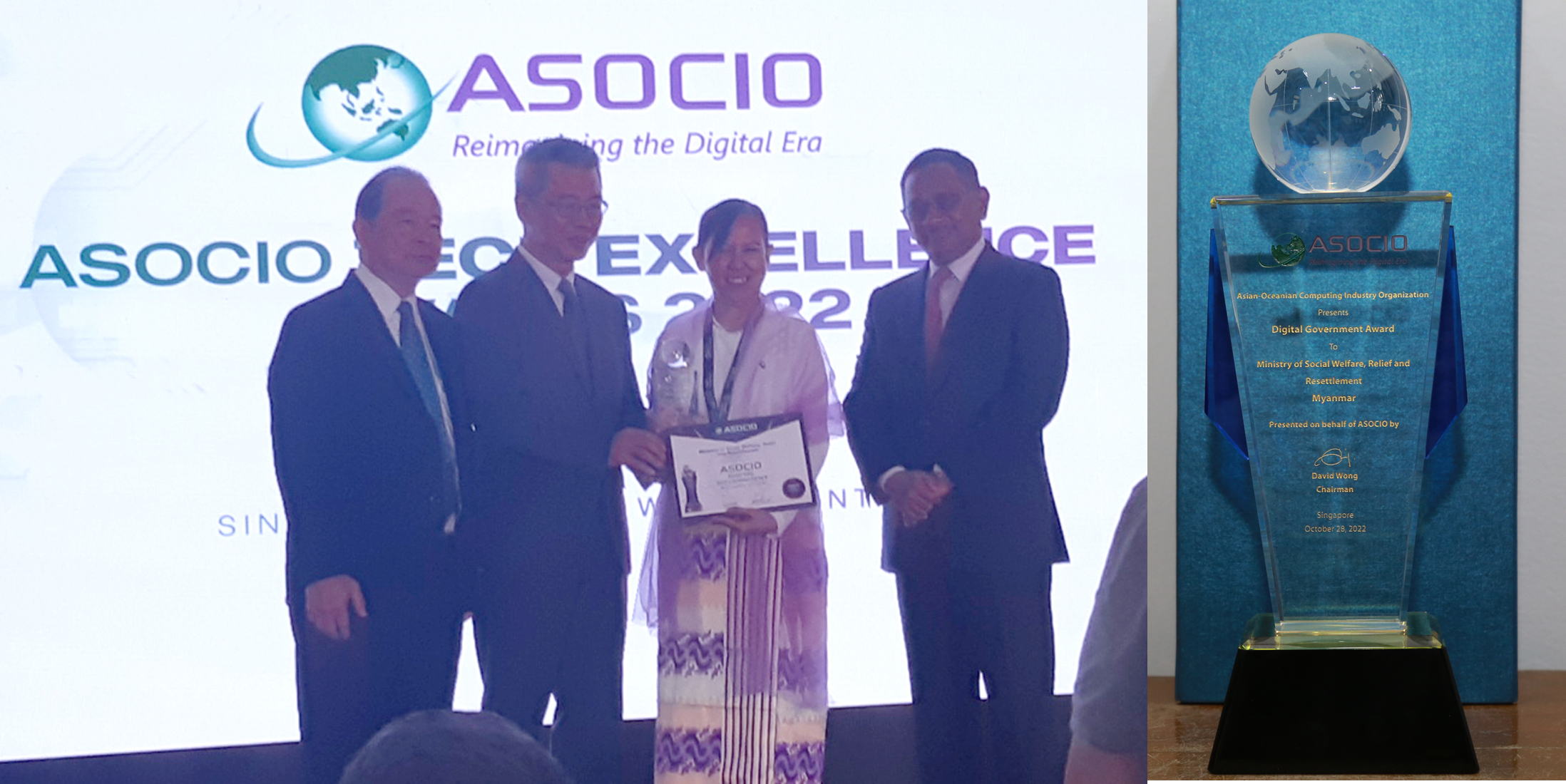 အဆိုပါ Summit ၏ ညပိုင်း Gala Dinner တွင် ASOCIO Digital Government Award 2022 ကို ပေးအပ်ချီးမြှင့်ရာ လူမှုဝန်ထမ်း၊ ကယ်ဆယ်ရေးနှင့် ပြန်လည်နေရာချထားရေးဝန်ကြီးဌာနက ဆောင်ရွက်လျက်ရှိသည့် လူမှုရေး သတင်းအချက်အလက် စီမံခန့်ခွဲမှုစနစ် Social Management Information System (SMIS) ၏ ကဏ္ဍတစ်ခုဖြစ်သော လူမှုဖြစ်ရပ်စီမံခန့်ခွဲမှု သတင်းစနစ် (Case Management Information System-CMIS) ကို ကာကွယ်ရေးဝန်ကြီးဌာန၊ မြန်မာနိုင်ငံကွန်ပျူတာ အသင်းချုပ်တို့၏ ပံ့ပိုးကူညီမှုဖြင့်ဝင်ရောက်ယှဉ်ပြိုင်ခဲ့ပြီး ဝန်ကြီးဌာနအနေဖြင့် ASOCIO Digital Government Award 2022 ကိုရရှိခဲ့ရာ ဝန်ကြီးဌာနကိုယ်စား လူမှုဝန်ထမ်းဦးစီးဌာန ညွှန်ကြားရေးမှူးချုပ် ဒေါက်တာစန်းစန်းအေးက ဆုလက်ခံရယူခဲ့ကာ ဆုလက်ခံအပြီးတွင် ASOCIO အသင်းချုပ်၏ ဥက္ကဋ္ဌနှင့် တာဝန်ရှိသူများကို အမှတ်တရ လက်ဆောင်များပေးအပ်ခဲ့သည်။ ၂၀၂၂ ခုနှစ်တွင် ကျင်းပသည့် ASOCIO Digital Summit တွင် နိုင်ငံပေါင်း (၁၄) နိုင်ငံက Digital Government Award အပါအဝင် ဆုပေါင်း(၅၄)ခု ပေးအပ်ခဲ့ကြောင်း သိရသည်။