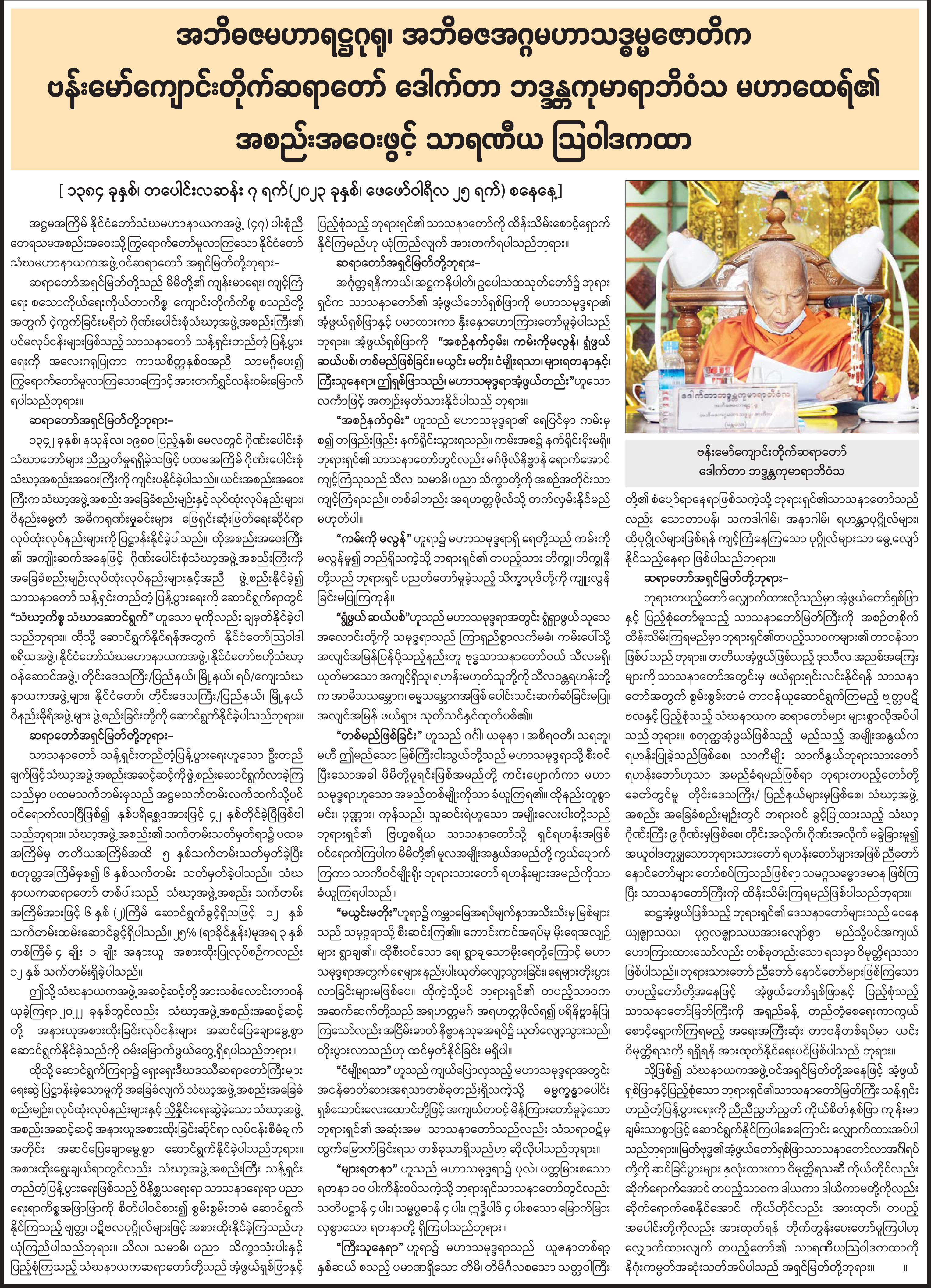 အဘိဓဇမဟာရဋ္ဌဂုရု၊ အဘိဓဇအဂ္ဂမဟာသဒ္ဓမ္မဇောတိက ဗန်းမော်ကျောင်းတိုက်ဆရာတော် ဒေါက်တာ ဘဒ္ဒန္တကုမာရာဘိဝံသ မဟာထေရ်၏ အစည်းအဝေးဖွင့်ပွဲ သာရဏီယ ဩဝါဒကထာ