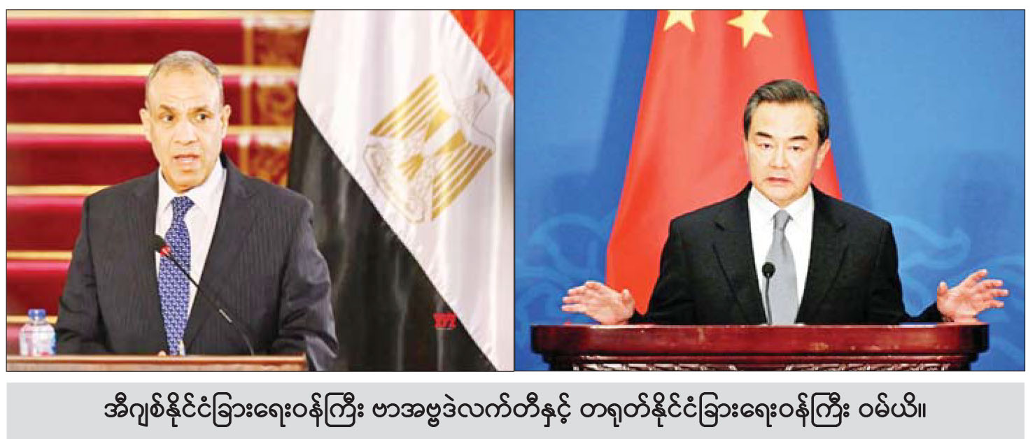 ဒေသတွင်းအရေးများနှင့် ပတ်သက်၍ တာဝန်ရှိသူနှစ်ဦးအကြား အမြင်ချင်းဖလှယ်ဆွေးနွေးခဲ့သည်။ အီဂျစ်နိုင်ငံအနေဖြင့်် ဂါဇာဒေသအပစ်အခတ်ရပ်စဲရေး အကောင်အထည်ဖော် ဆောင်ရွက်နိုင်ရေးနှင့် ဂါဇာဒေသ ပြန်လည်ထူထောင်ရေးအတွက် အာရပ်နိုင်ငံများနှင့် လက်တွဲ၍ ကြိုးပမ်းဆောင်ရွက်မည် ဖြစ်ပြီး ဂါဇာဒေသမှ ပါလက်စတိုင်းများအား အခြားနေရာများသို့ ပြောင်းရွှေ့စေမည့်ကိစ္စကို လက်မခံကြောင်း အီဂျစ်နိုင်ငံခြားရေးဝန်ကြီးက ပြောကြားသည်။ ဂါဇာဒေသတွင် ငြိမ်းချမ်းရေး ရရှိရေးနှင့် ပြန်လည်ထူထောင်ရေးလုပ်ငန်းများ ဆောင်ရွက်နိုင်ရေးအတွက် တရုတ်နိုင်ငံက ကူညီမည်ဟုယုံကြည်ကြောင်း အီဂျစ်နိုင်ငံခြားရေးဝန်ကြီးက မှတ်ချက်ပြု ပြောကြားသည်။