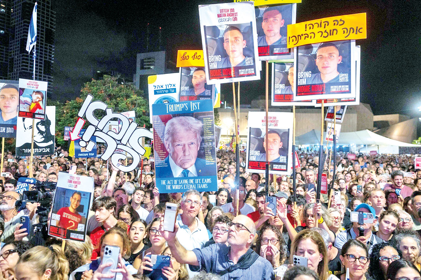 ဓားစာခံများ၏ မိသားစုများနှင့် ၎င်းတို့၏ ထောက်ခံသူများက အစ္စရေး၏ အကြီးဆုံးစီးပွားရေး မြို့တော် တဲအဗစ်မြို့၌ စနေနေ့ညတိုင်း တွေ့ဆုံကြသည်။ ယမန်နေ့တွေ့ဆုံမှုသည် အပစ်အခတ်ရပ်စဲရေး စတင်အသက်ဝင်ပြီးနောက်ပိုင်း ပထမဆုံးအကြိမ် ဖြစ်သည်။