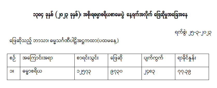 သာသနာရေးနှင့် ယဉ်ကျေးမှုဝန်ကြီးဌာန၊ သာသနာရေးဦးစီးဌာနက ကြီးမှူး၍ နှစ်စဉ်ကျင်းပသော ၂၀၂၃ ခုနှစ်၊ အစိုးရဓမ္မာစရိယစာမေးပွဲကို ယနေ့(ပဉ္စမနေ့)နိုင်ငံတစ်ဝန်းရှိ စာဖြေဌာန ၇၀ ဌာနတို့တွင် စာဖြေစာရင်းသွင်း ၁၂၅၇၃ ပါး/ဦးအနက် ၉၇၃၀ ပါး/ဦး ဖြေဆိုကြသဖြင့် ၇၇ ဒသမ ၃၉ ရာခိုင်နှုန်း ဖြေဆိုကြကြောင်း သာသနာရေးဦးစီးဌာနမှ သိရသည်။