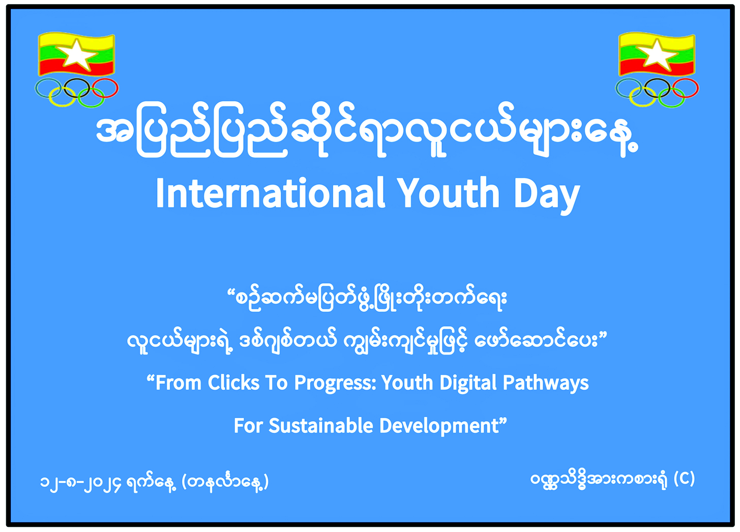 ယနေ့ကမ္ဘာပေါ်မှာ သဘာဝဘေးအန္တရာယ်၊ ကပ်ရောဂါ စတဲ့ကမ္ဘာ့ရေးရာပြဿနာတွေ ပေါ်ပေါက် နေပါတယ်။ ဒါ့ပြင် လူသားတို့ကြောင့် ရာသီဥတု မညီမျှမှု၊ အစွန်းရောက်မှု၊ သဟဇာတပျက်ပြားမှု တွေကလည်း ကမ္ဘာ့အန္တရာယ်အဖြစ် တွန်းပို့နေပါ တယ်။  လူငယ်စွမ်းအားဟာ    မျက်မှောက်ကာလ အခက်အခဲတွေ  ဖြေရှင်းရာမှာ  အရေးပါပါတယ်။ လူငယ်တွေဟာ   အနာဂတ်နိုင်ငံတော်တာဝန်ကို ပခုံးပြောင်းထမ်းဆောင်ကြရပါမယ်။ နိုင်ငံတစ်ခုတိုးတက်ပြောင်းလဲဖို့ ဖော်ဆောင်ရာမှာ လူငယ်တွေ ရဲ့စည်းလုံးမှု၊   ဦးဆောင်နိုင်မှုတို့နဲ့    ပူးပေါင်း တည်ဆောက်ရပါမယ်။  လူငယ်အပေါင်းကလည်း မိမိနိုင်ငံအရေးသာမကဘဲ ကမ္ဘာ့အရေးကိုပါ လေ့လာ ရပါမယ်။ လေ့လာမှုကနေရရှိတဲ့ ဖြစ်စဉ်ဖြစ်ရပ်တွေ အပေါ် သင်ခန်းစာယူမှု၊  အတွေ့အကြုံကောင်းတွေ ရရှိမှုတို့ကိုအသုံးချကာ   စွမ်းဆောင်ရည်ပြည့်ဝသူ တွေဖြစ်အောင်  ကြိုးစားရမှာက  လူငယ်တိုင်းရဲ့ တာဝန်ဖြစ်ပါတယ်။