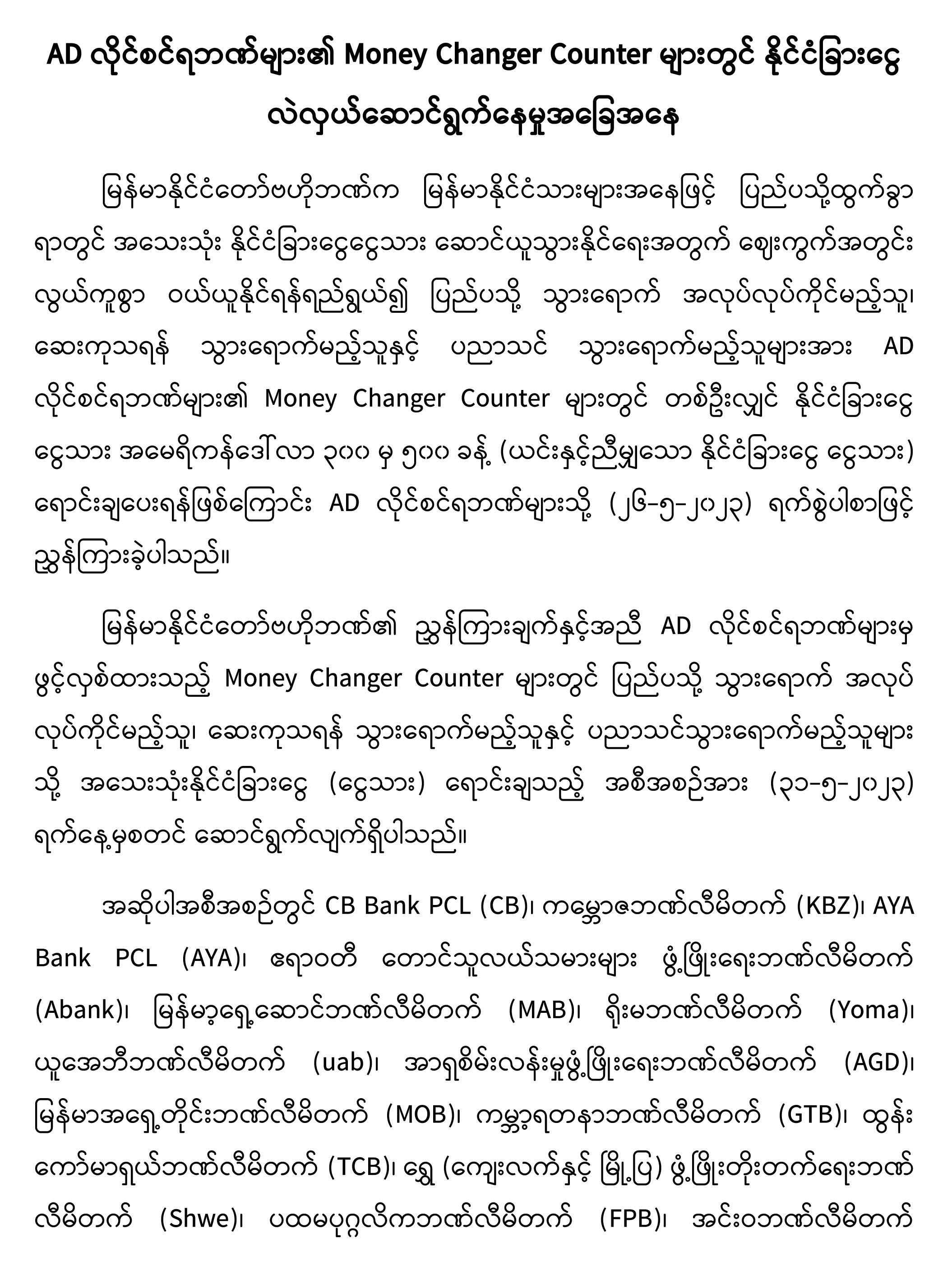 AD လိုင်စင်ရဘဏ်များ၏ Money Changer Counter များတွင် နိုင်ငံခြားငွေ လဲလှယ်ဆောင်ရွက်နေမှုအခြေအနေ