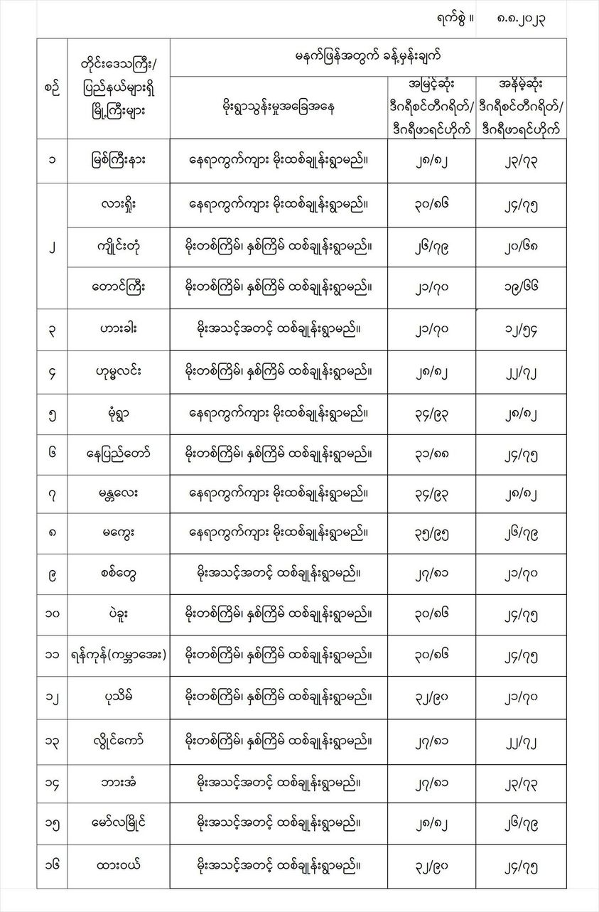 အောက်မှာဖော်ပြထားတာကတော့ မနက်ဖြန်အတွက် တိုင်းဒေသကြီးနှင့် ပြည်နယ်များရှိ မြို့ကြီးများ၏ အမြင့်ဆုံးအပူချိန်၊ အနိမ့်ဆုံးအပူချိန်