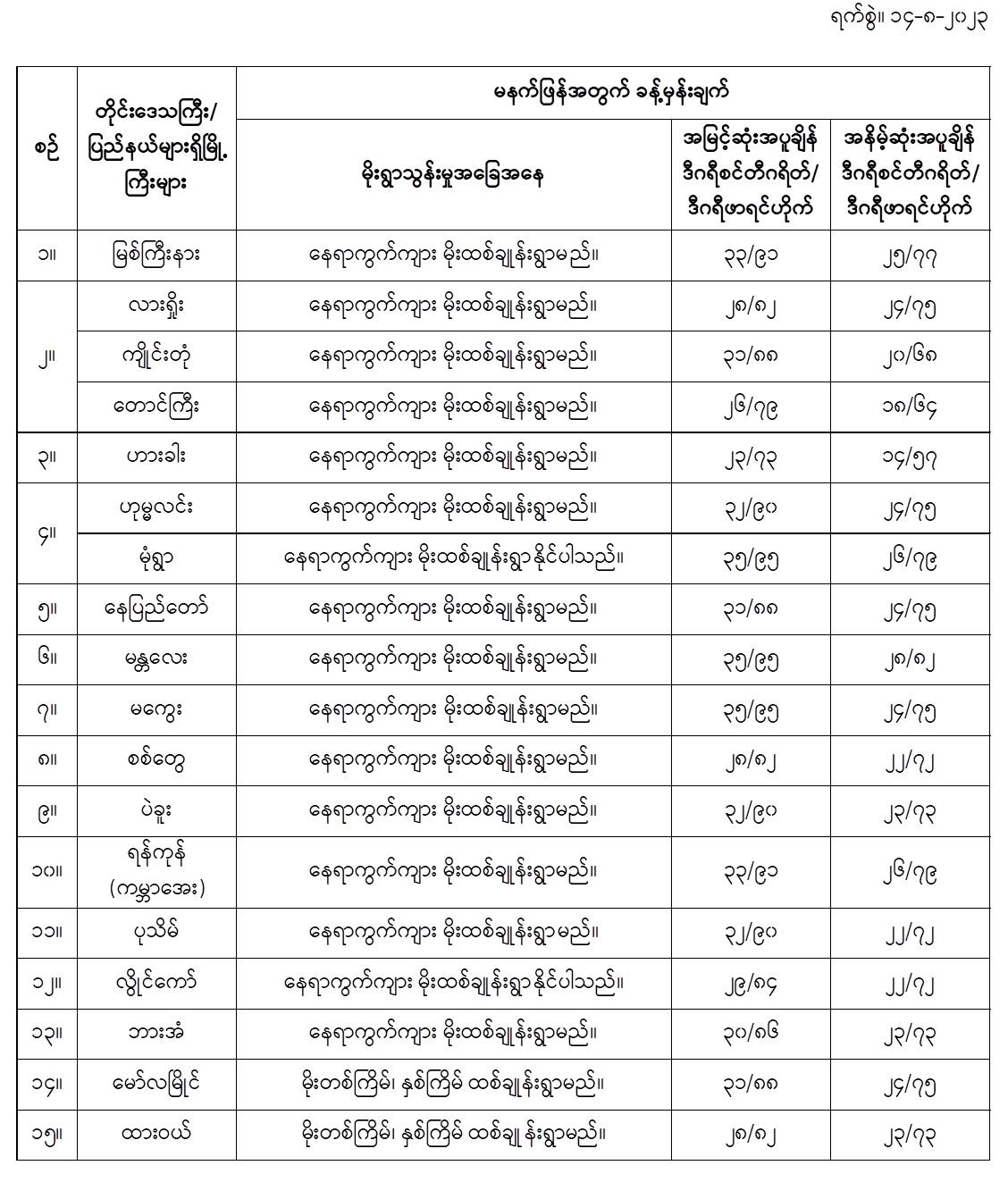 အောက်မှာဖော်ပြထားတာကတော့ မနက်ဖြန်အတွက် တိုင်းဒေသကြီးနှင့် ပြည်နယ်များရှိ မြို့ကြီးများ၏ အမြင့်ဆုံးအပူချိန်၊ အနိမ့်ဆုံးအပူချိန်နှင့် မိုးလေဝသခန့်မှန်းချက်