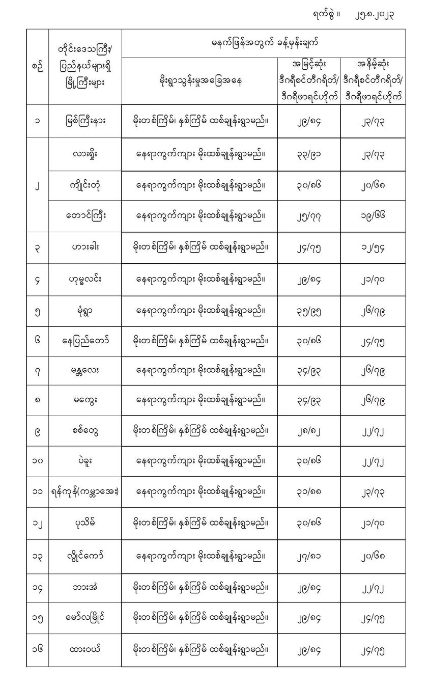 အောက်မှာဖော်ပြထားတာကတော့ မနက်ဖြန်အတွက် တိုင်းဒေသကြီးနှင့် ပြည်နယ်များရှိ မြို့ကြီးများ၏ အမြင့်ဆုံးအပူချိန်၊ အနိမ့်ဆုံးအပူချိန်နှင့် မိုးလေဝသခန့်မှန်းချက်