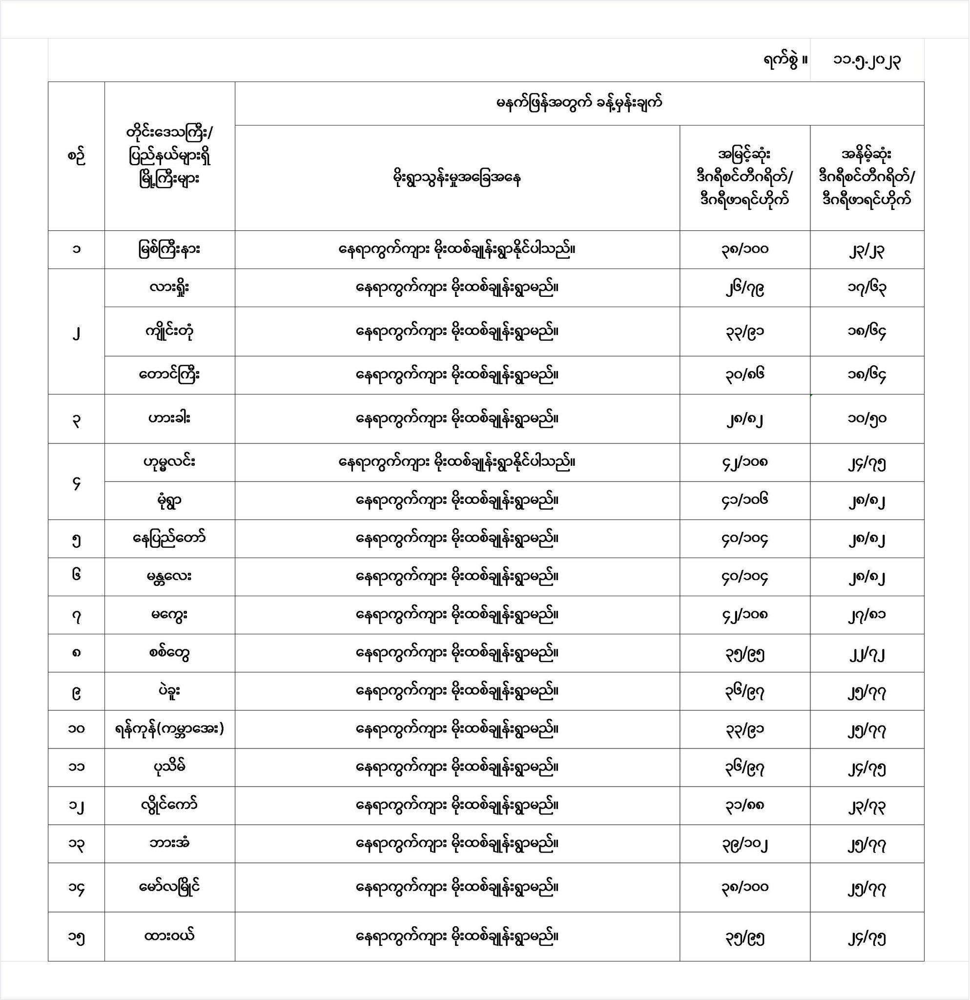 အောက်မှာဖော်ပြထားတာကတော့ မနက်ဖြန်အတွက် တိုင်းဒေသကြီးနှင့် ပြည်နယ်များရှိ မြို့ကြီးများ၏ အမြင့်ဆုံးအပူချိန်၊ အနိမ့်ဆုံးအပူချိန်နှင့် မိုးလေဝသခန့်မှန်းချက်